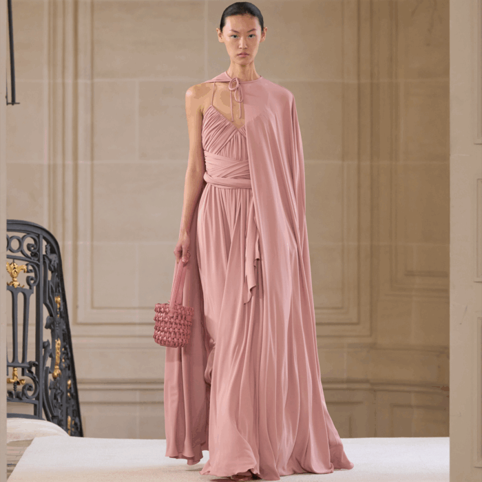 This long pink viscose dress features a V-neck and straps. The dress ties at the waist with a tie, creating a draped effect. You can wear it alone or with the cape in the same fabric and color. This long pink viscose cape features a lace-up front closure.