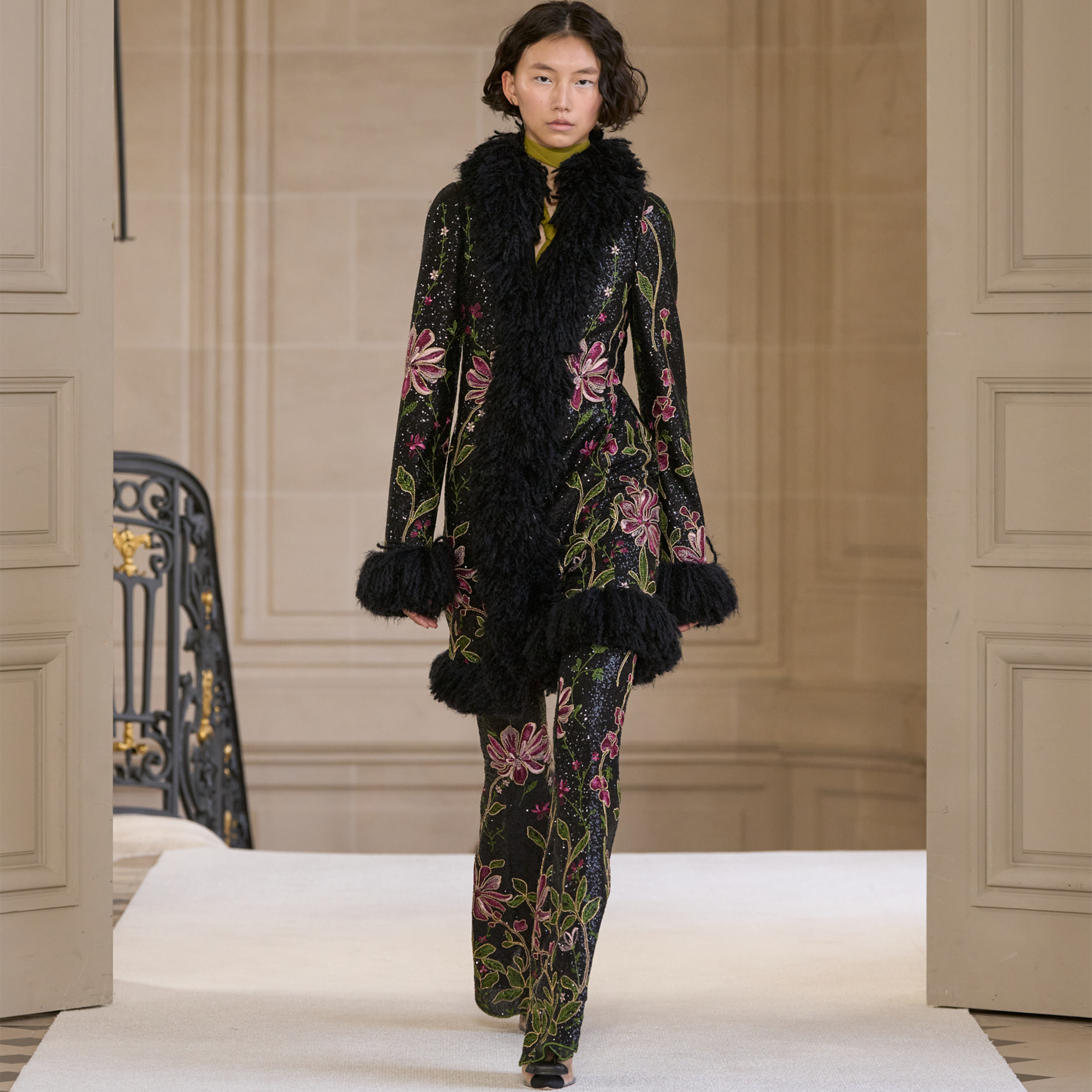 This black mid-length coat is entirely covered in sequins. They are embroidered and feature the Flower Screen print. The coat features fake fur on the collar and sleeve ends.
