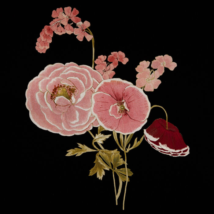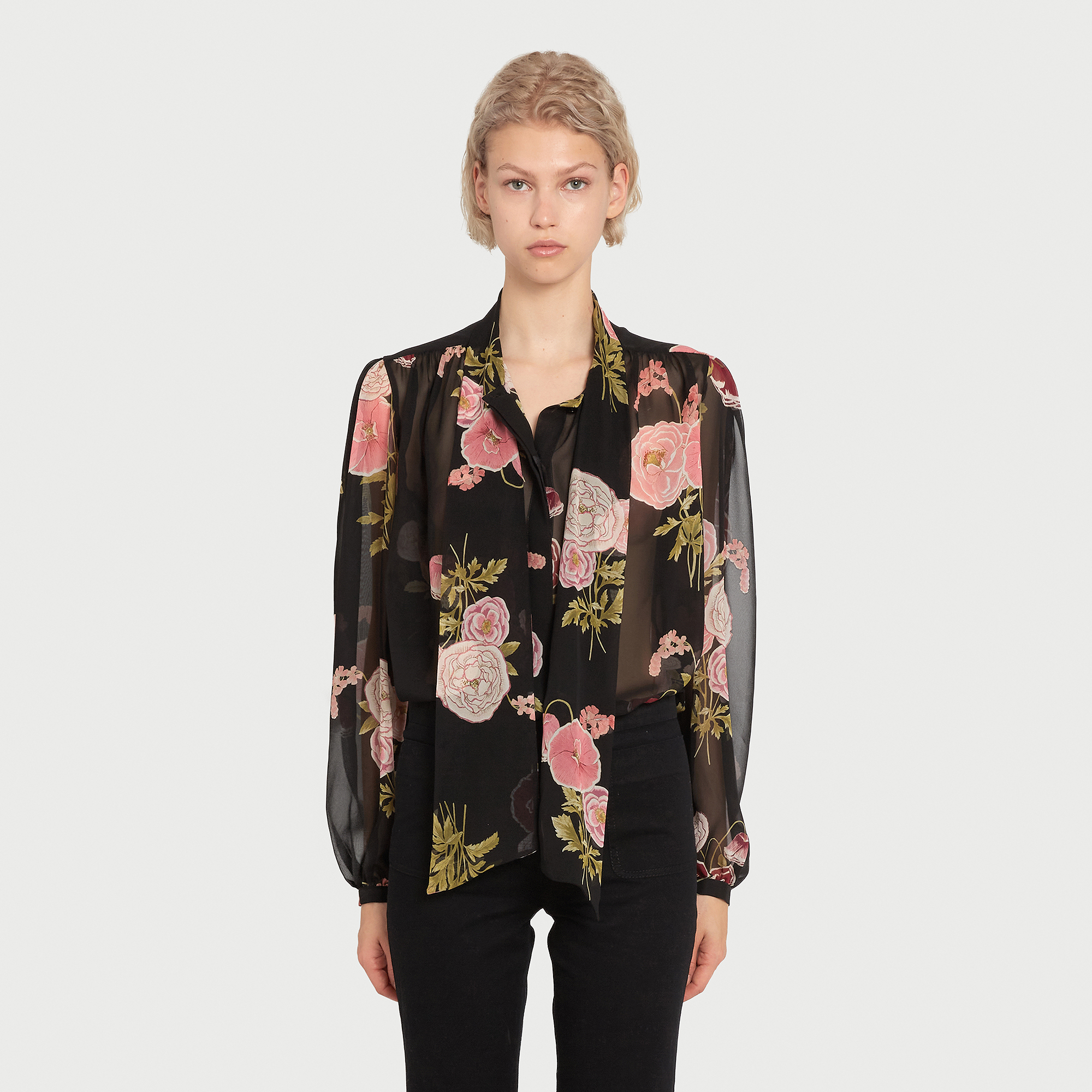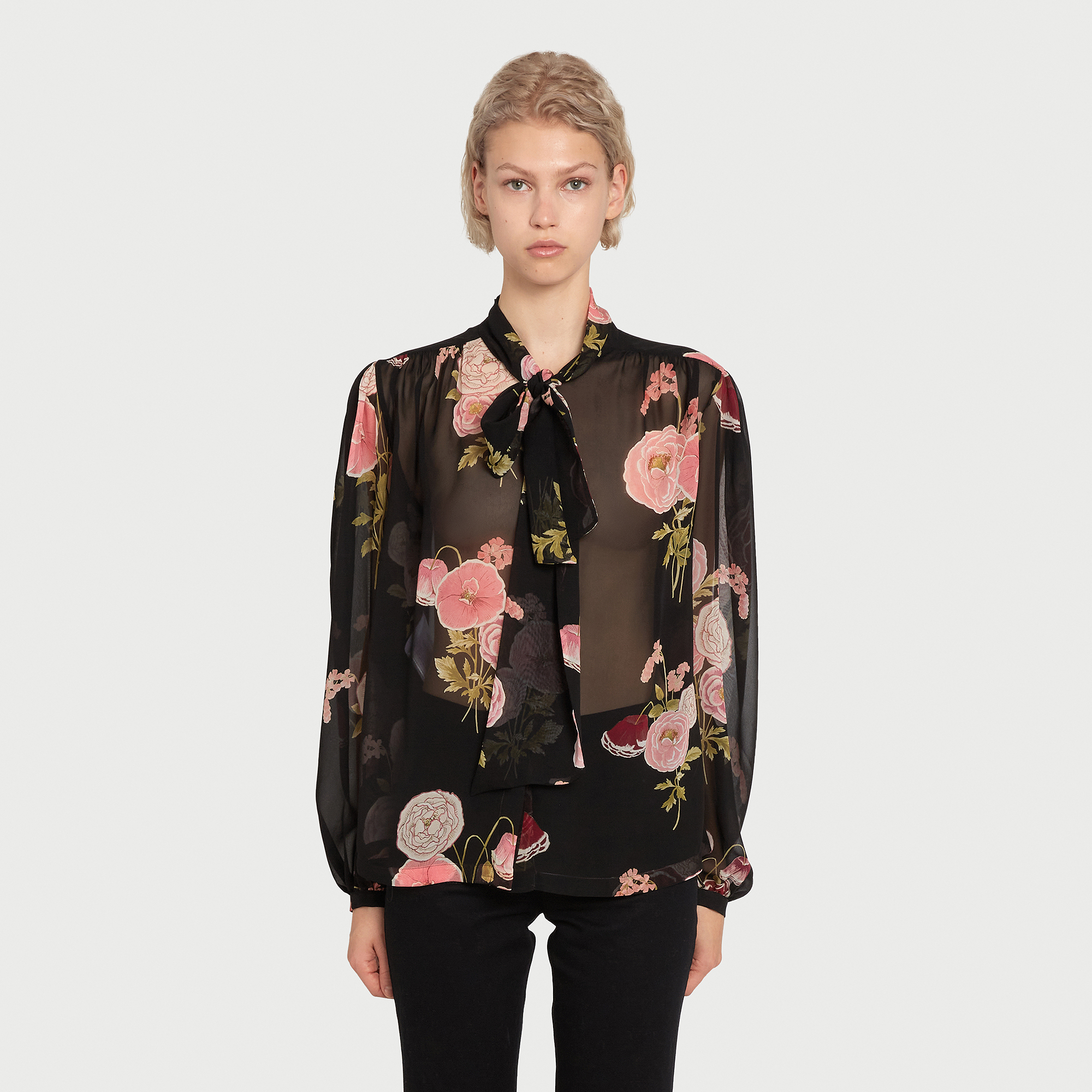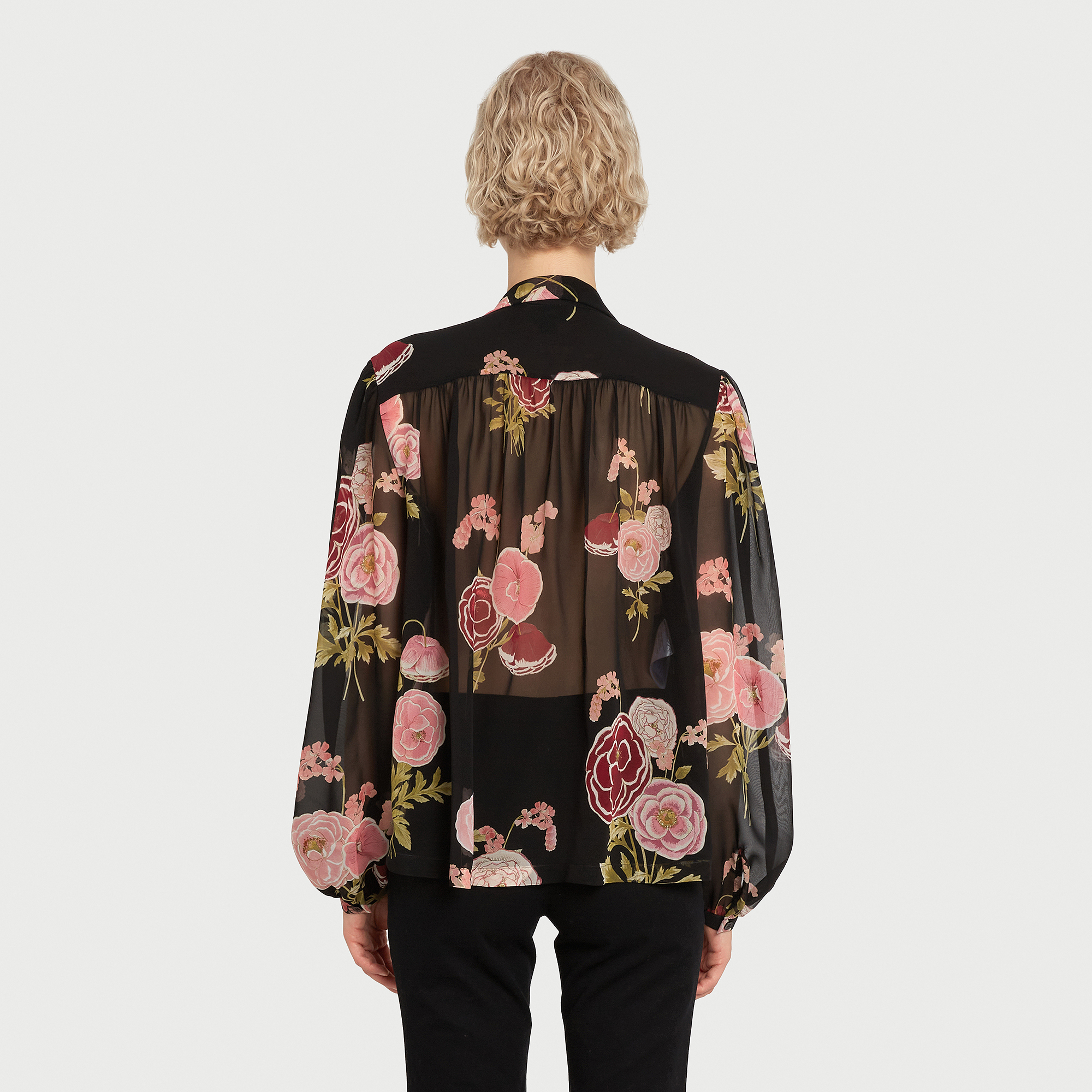 This black silk blouse showcases the Pansies print. It features a self bow-tie collar, bishop sleeves, a six-button placket with one visible and five concealed buttons and one GBV button at the end of each sleeve