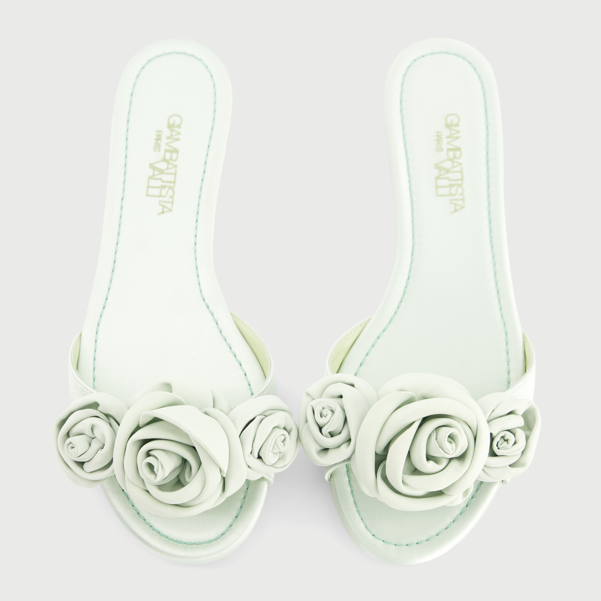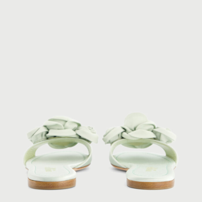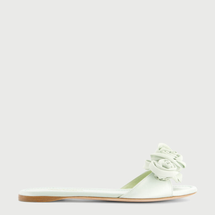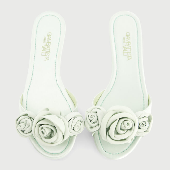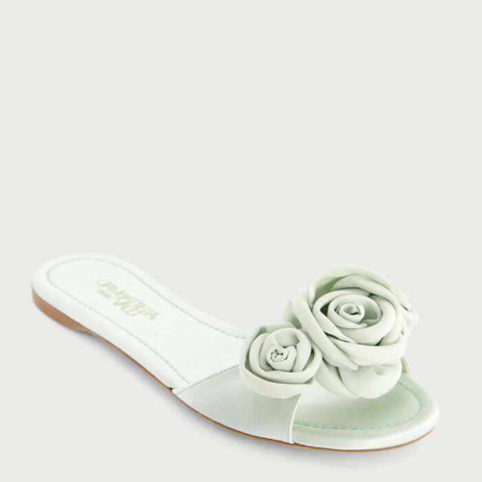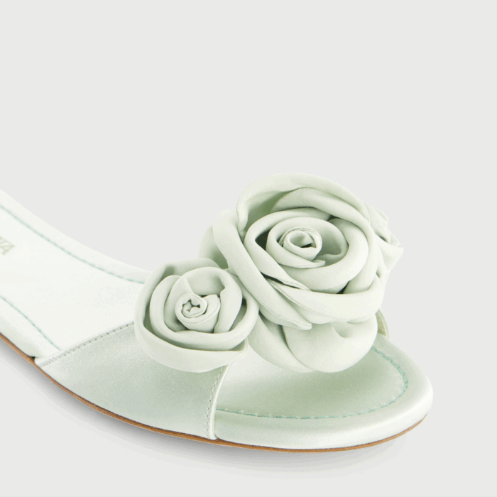 Mules plates aqua en satin avec roses