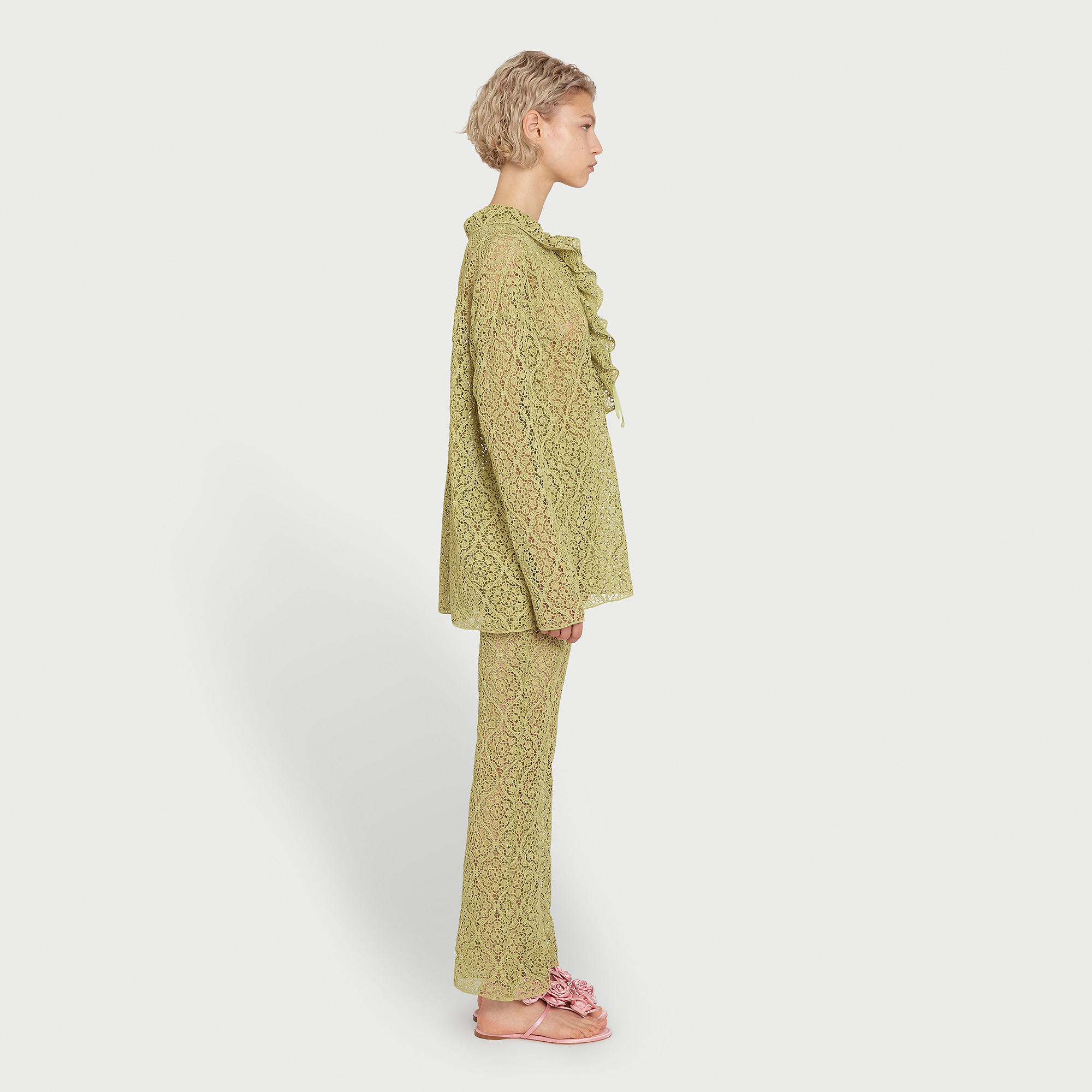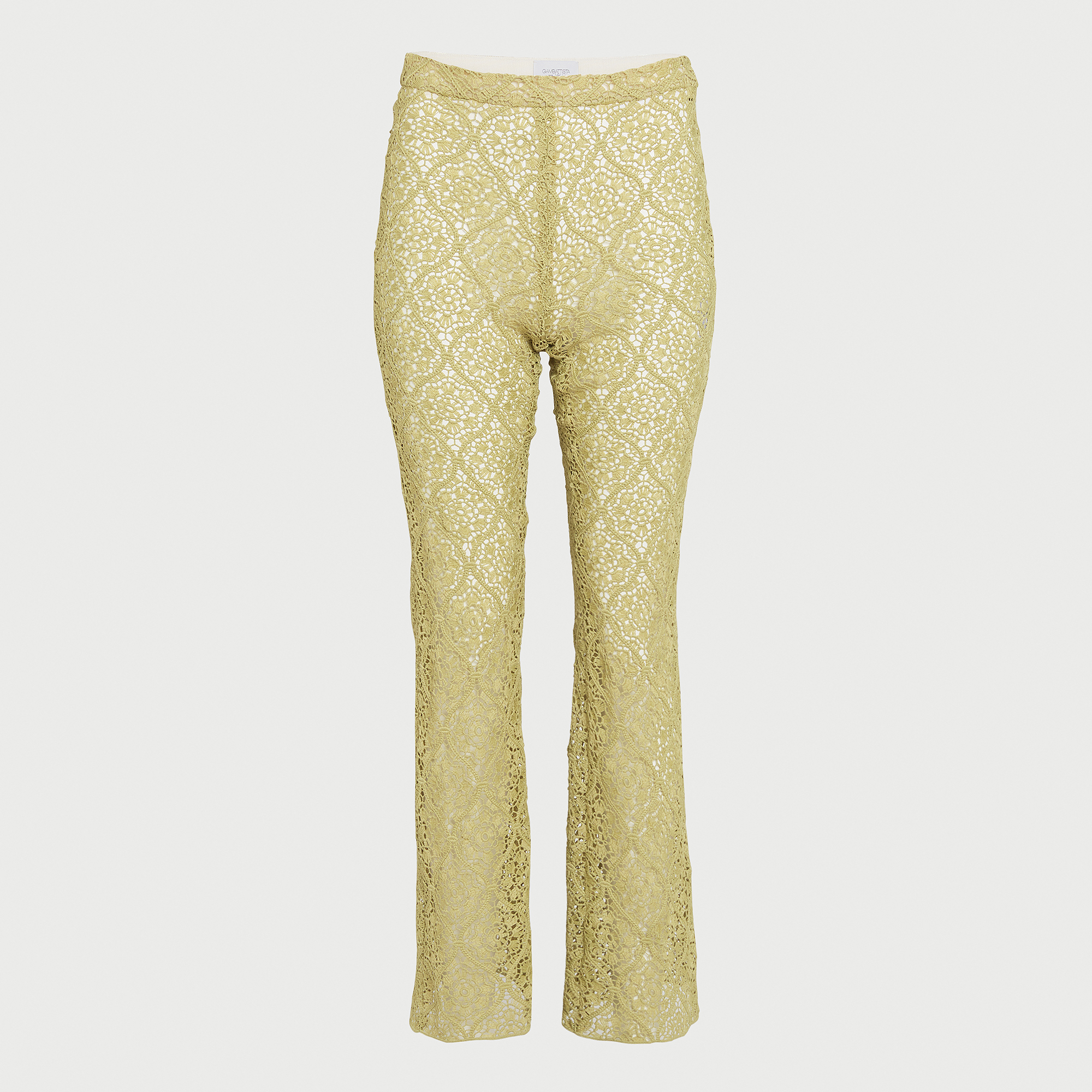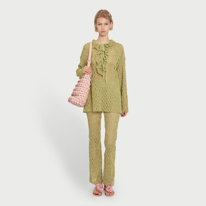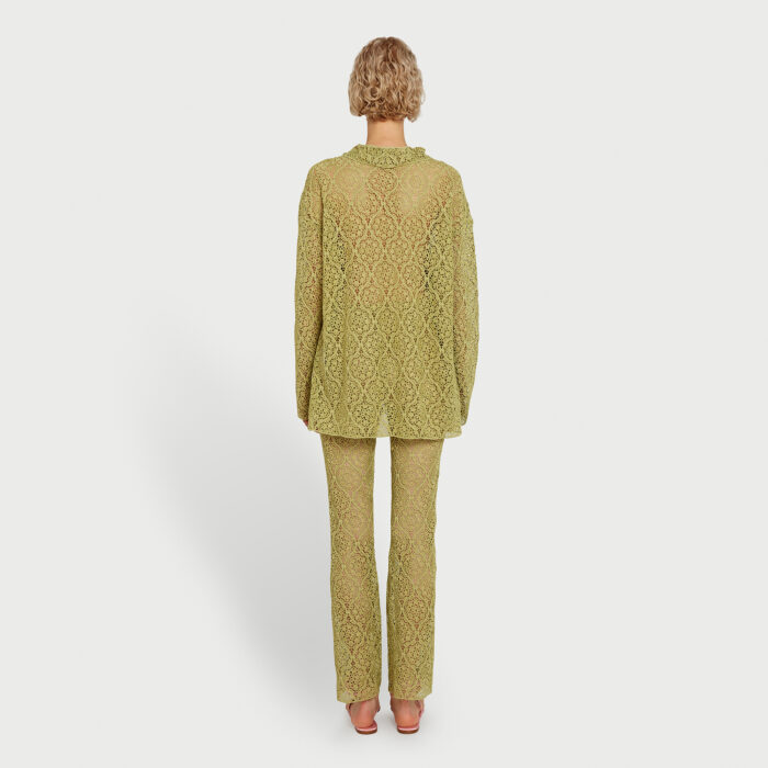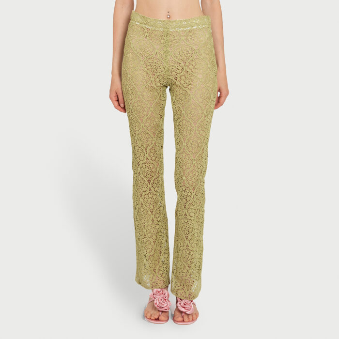 Ce pantalon vert en macramé à filigrane présente une silhouette évasée et une fermeture éclair invisible sur le côté gauche, accompagnée d’un crochet.