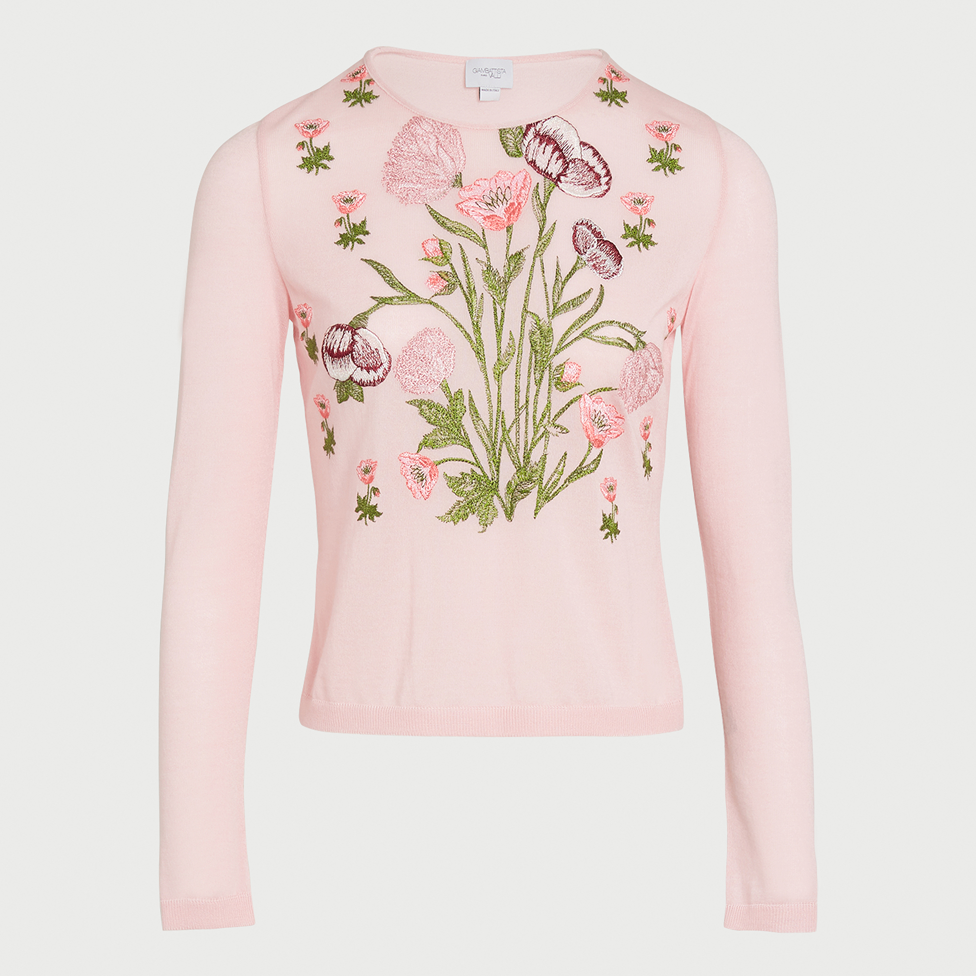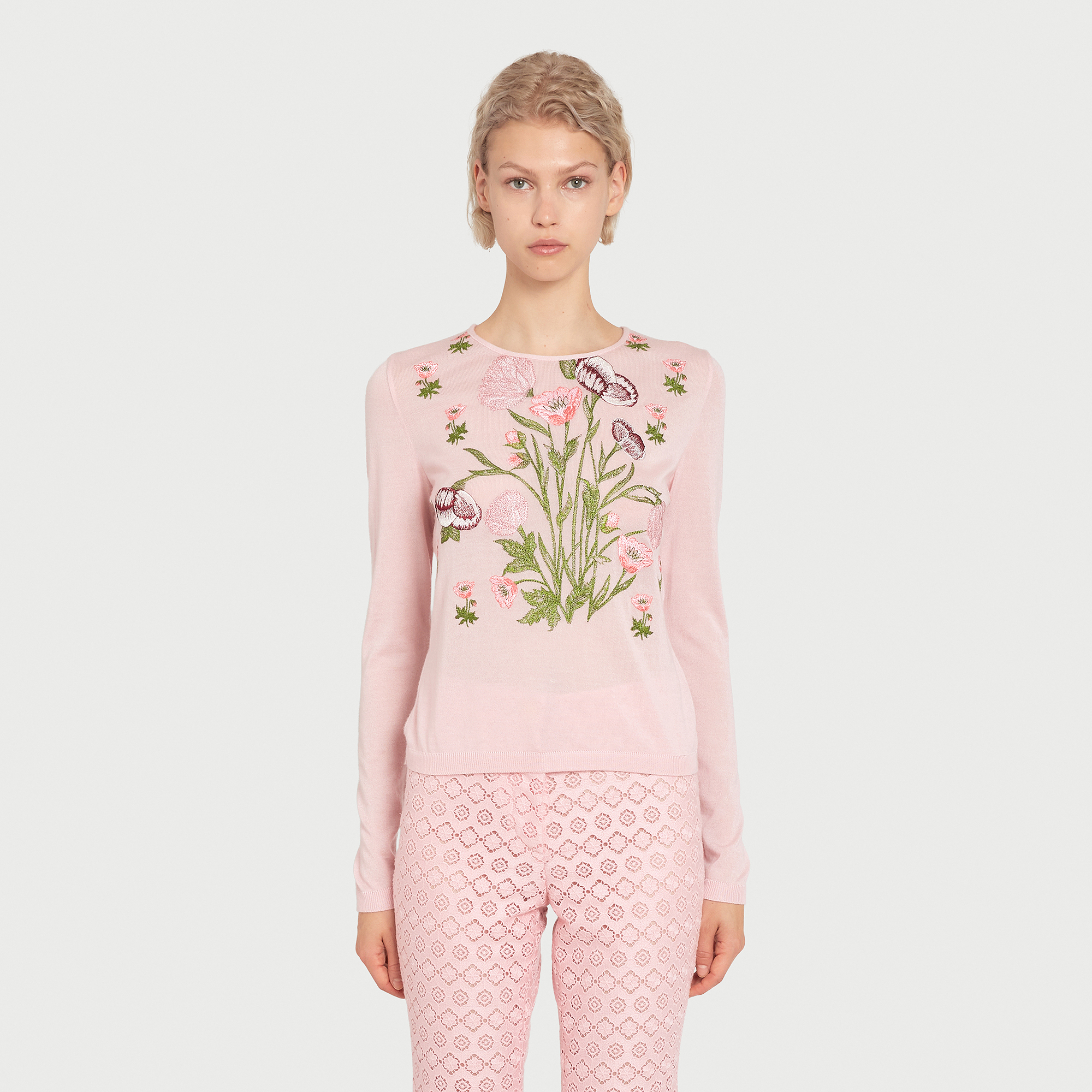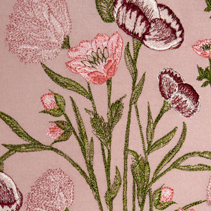 Ce top rose en maille à manches longues présente des anémones brodées.