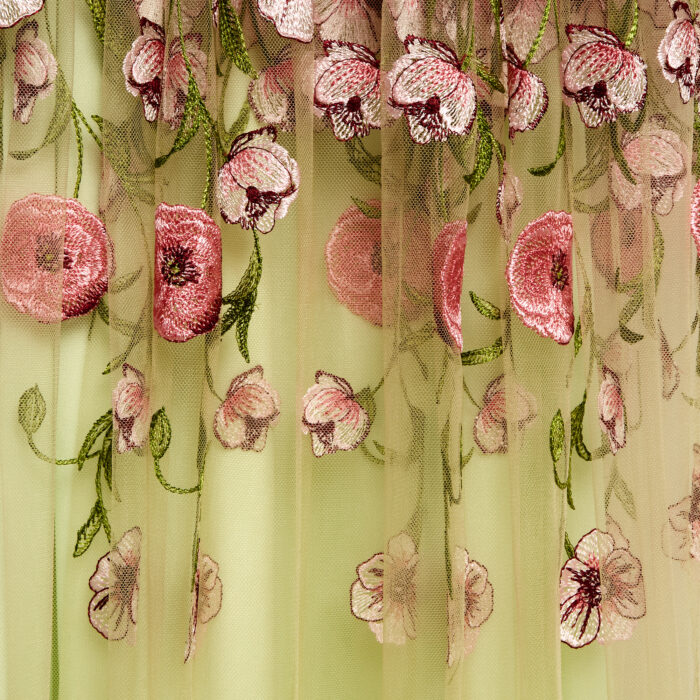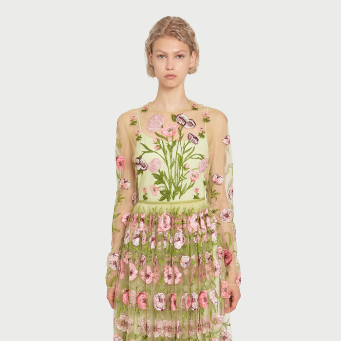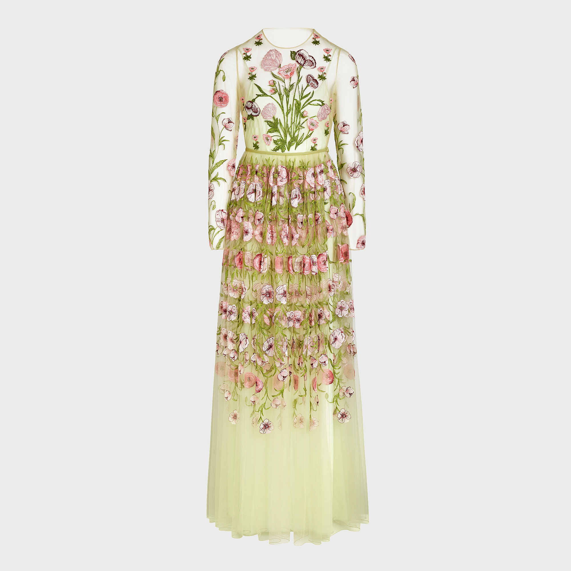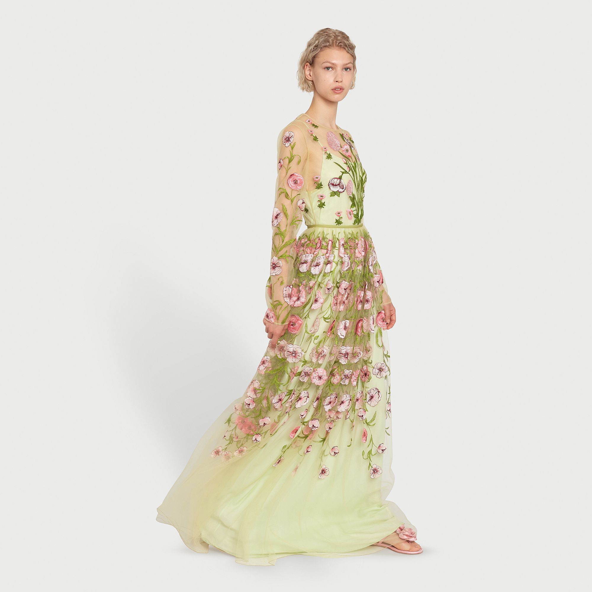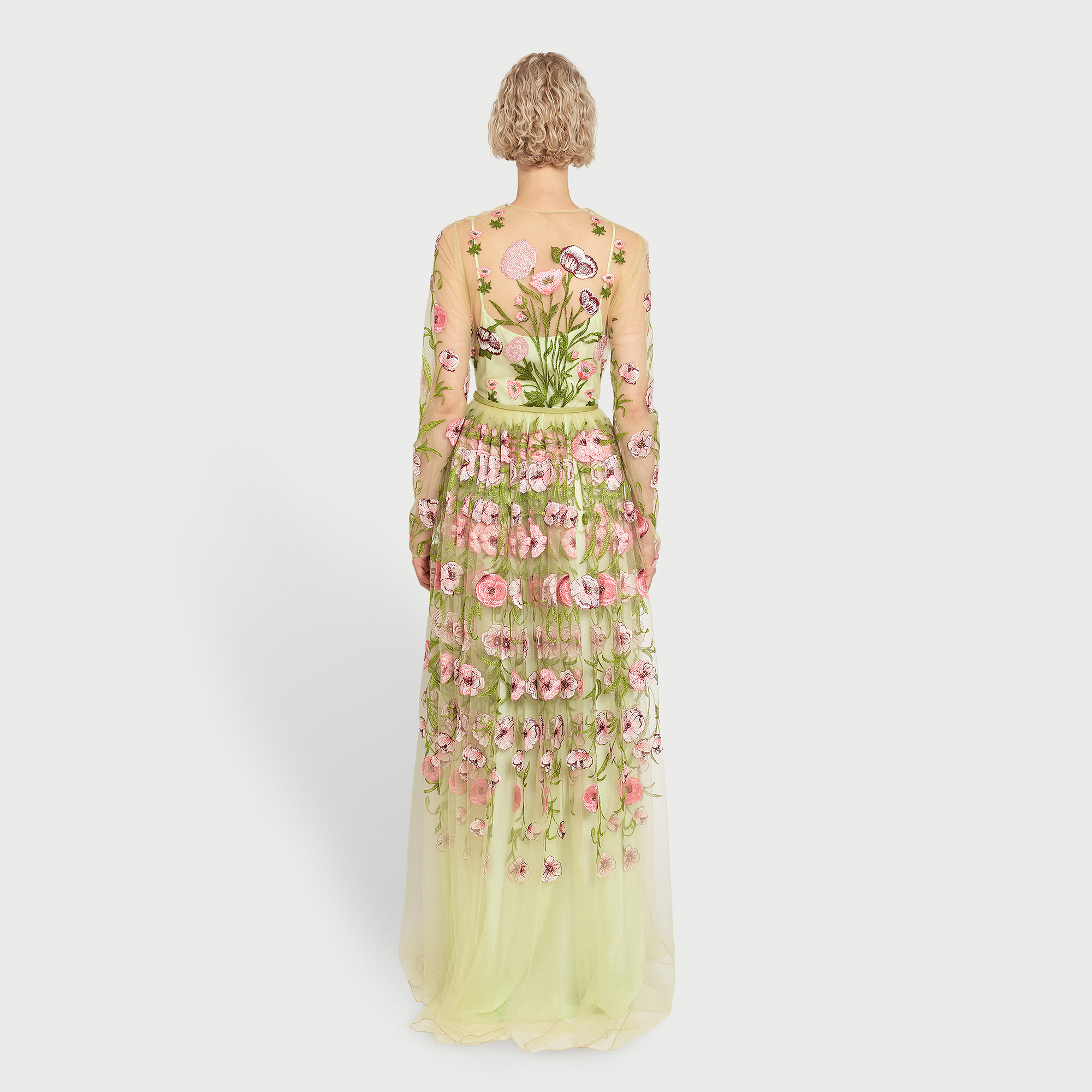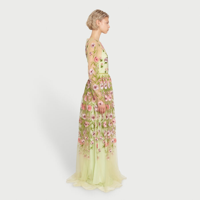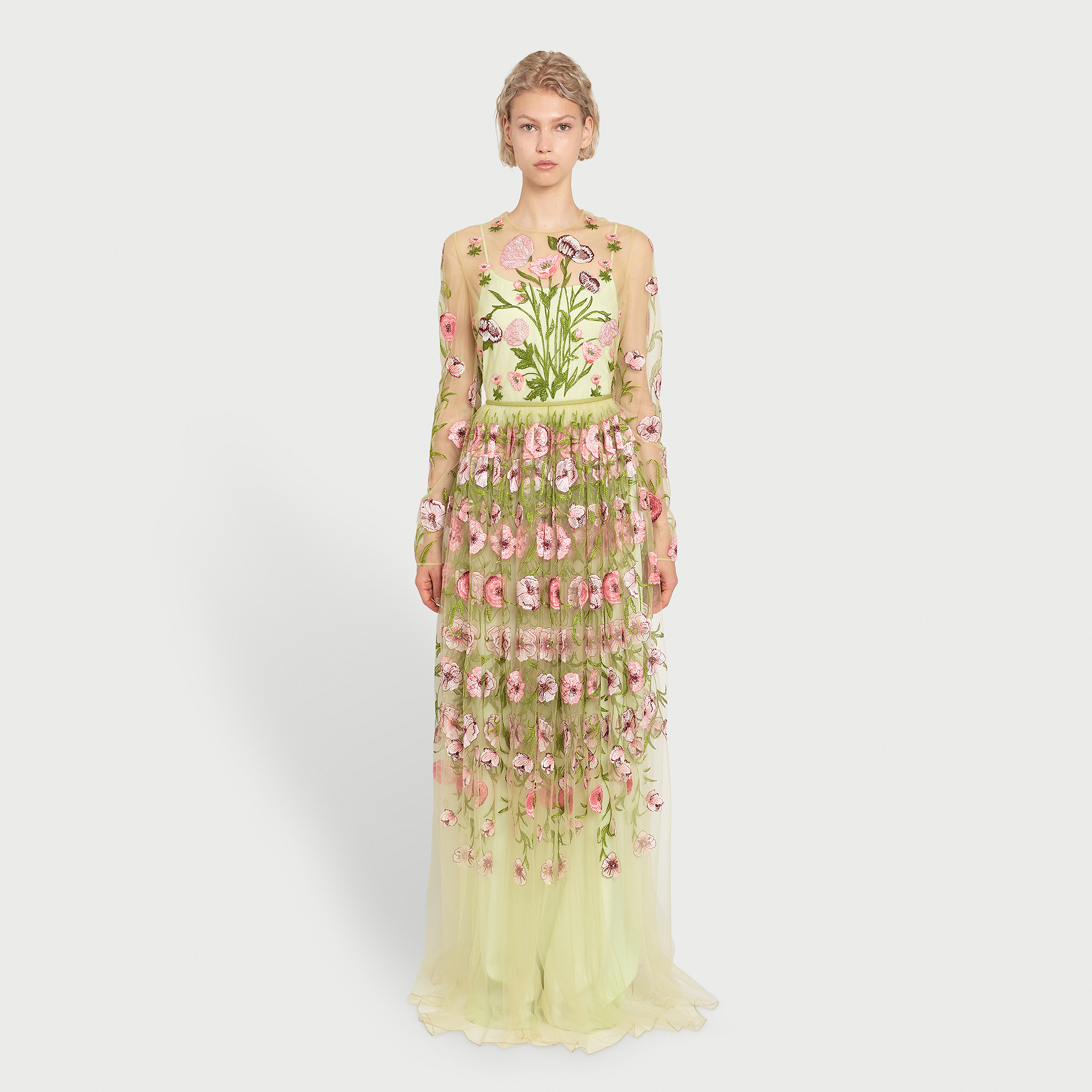 Cette robe longue à manches longues en tulle vert est brodée d’anémones. Elle présente une taille cintrée, une fermeture éclair invisible sur le côté gauche et trois boutons-pression à chaque poignet.