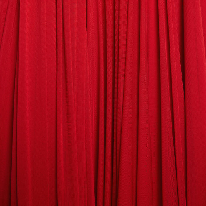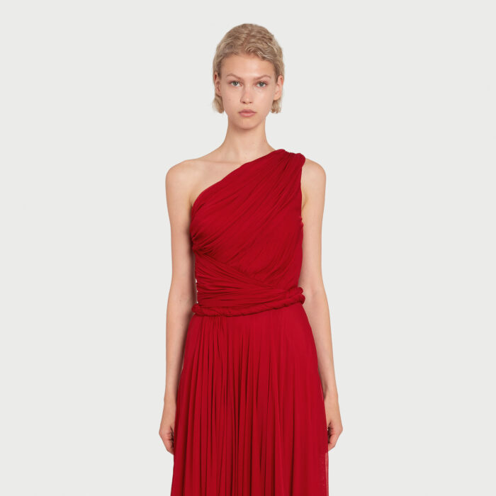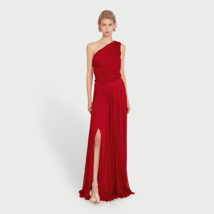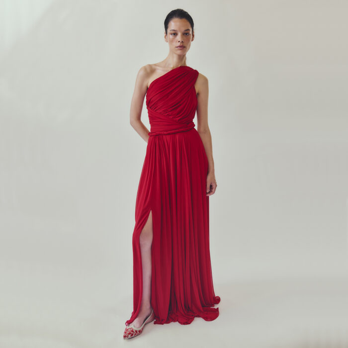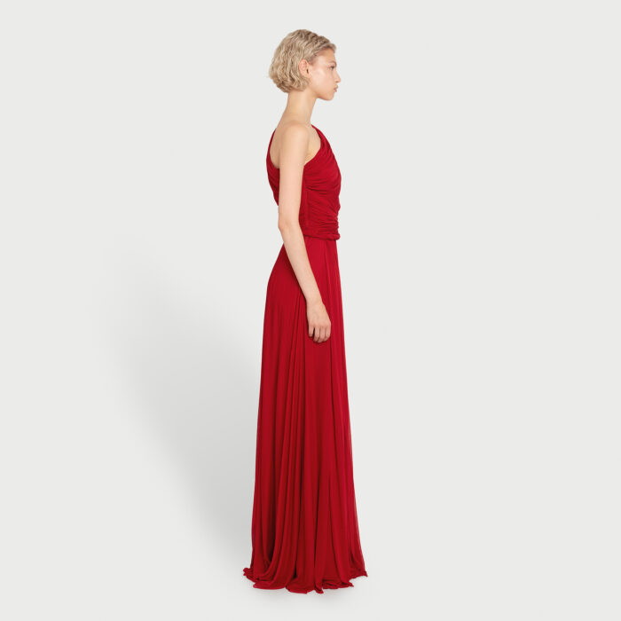 Cette robe longue en jersey rouge présente un décolleté asymétrique sur l’épaule gauche, une ceinture à nouer à la taille fixée par un petit bouton, et une jupe fluide.