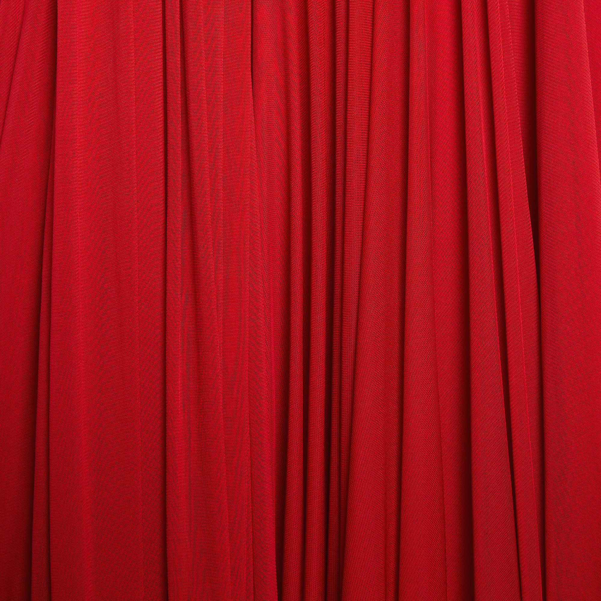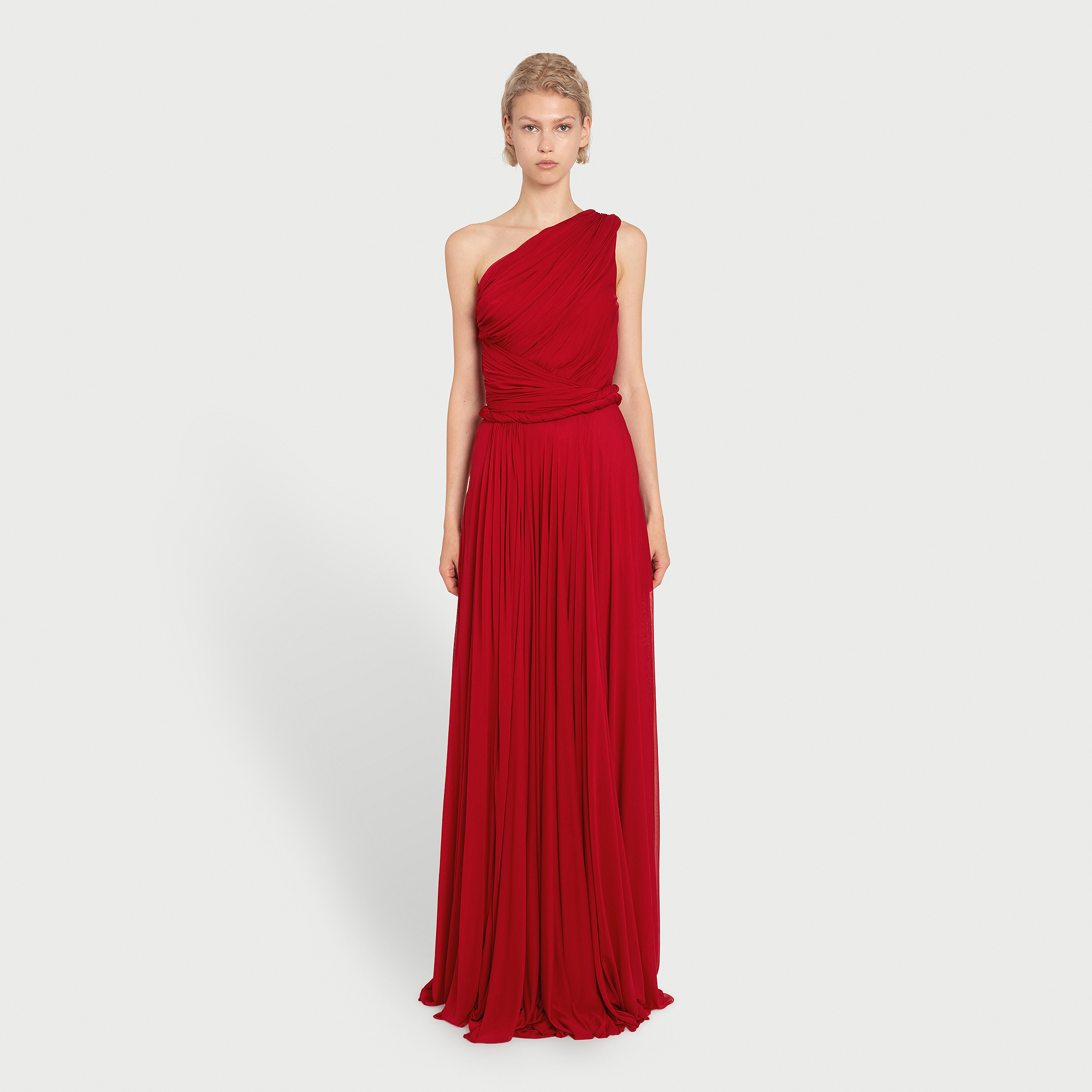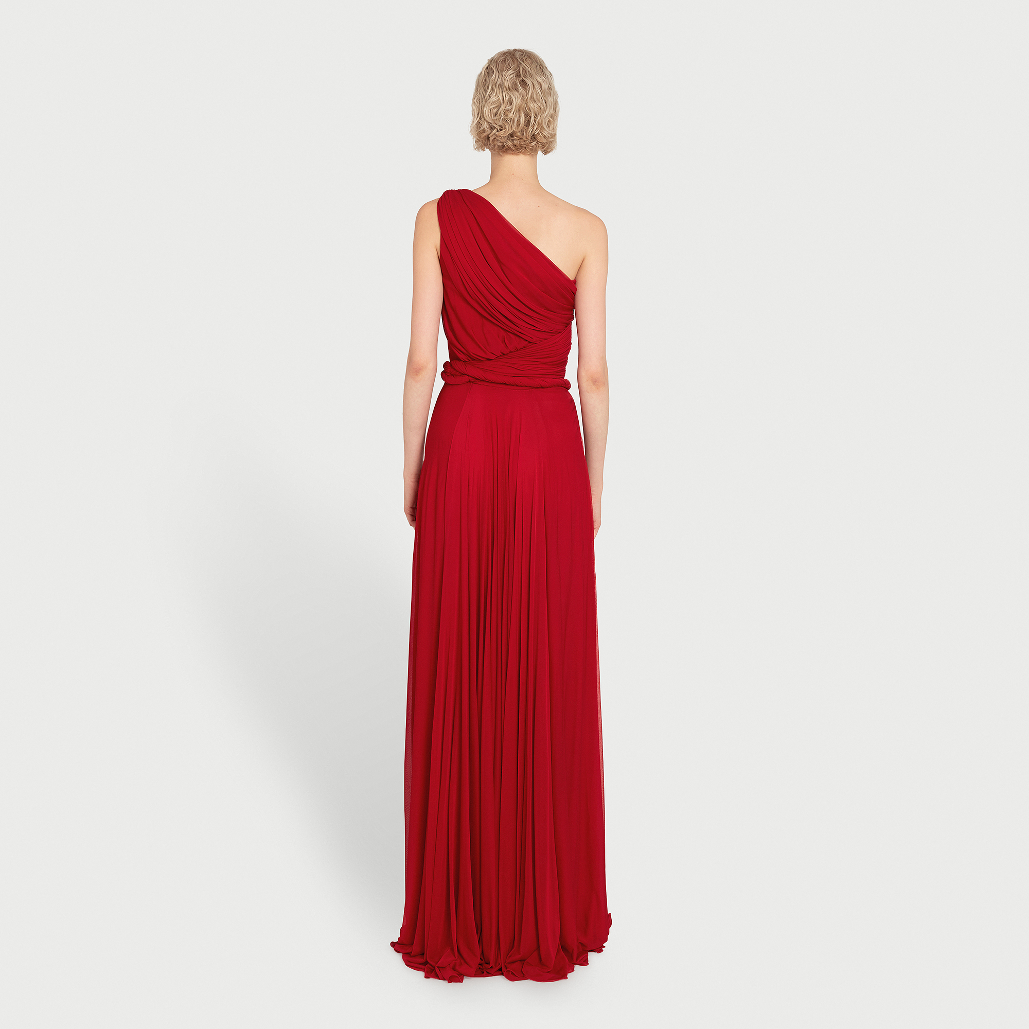 Cette robe longue en jersey rouge présente un décolleté asymétrique sur l’épaule gauche, une ceinture à nouer à la taille fixée par un petit bouton, et une jupe fluide.