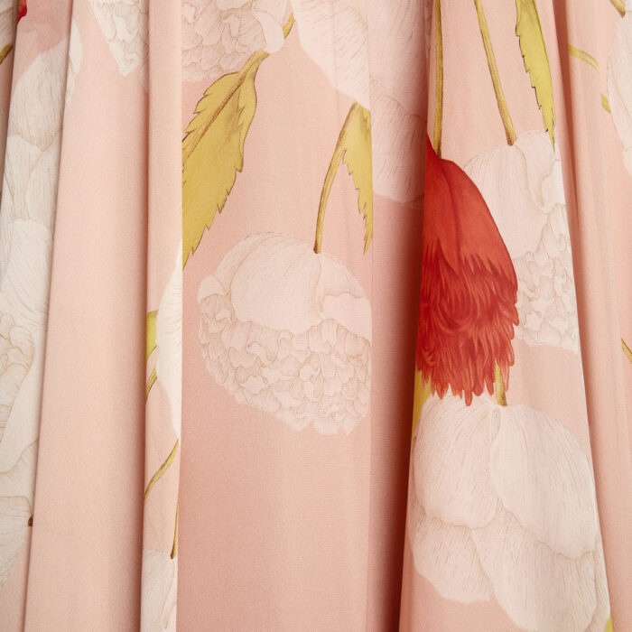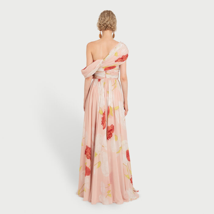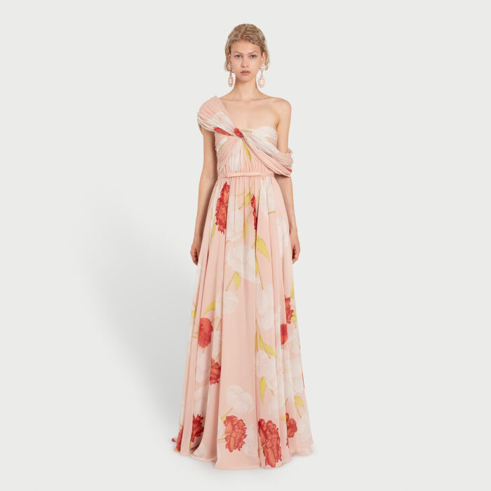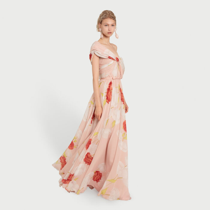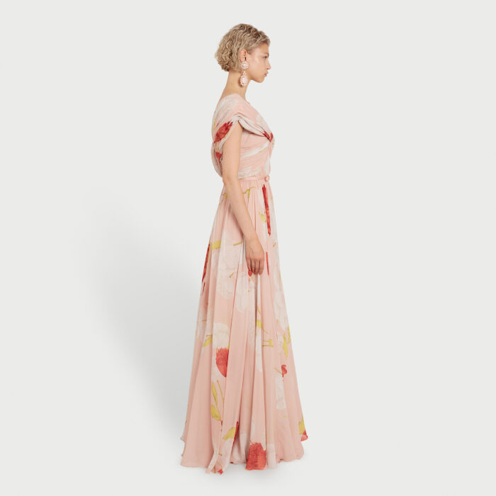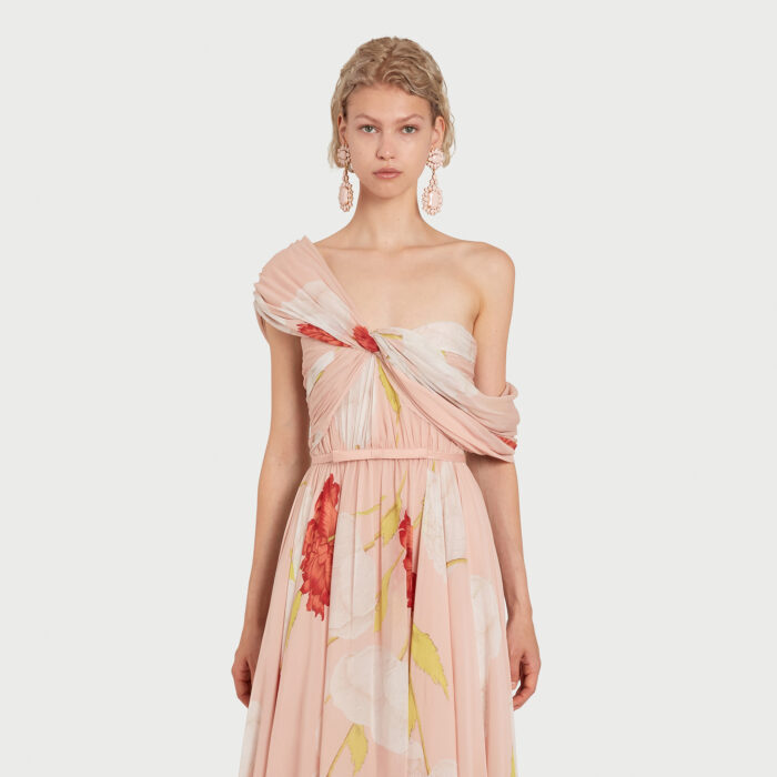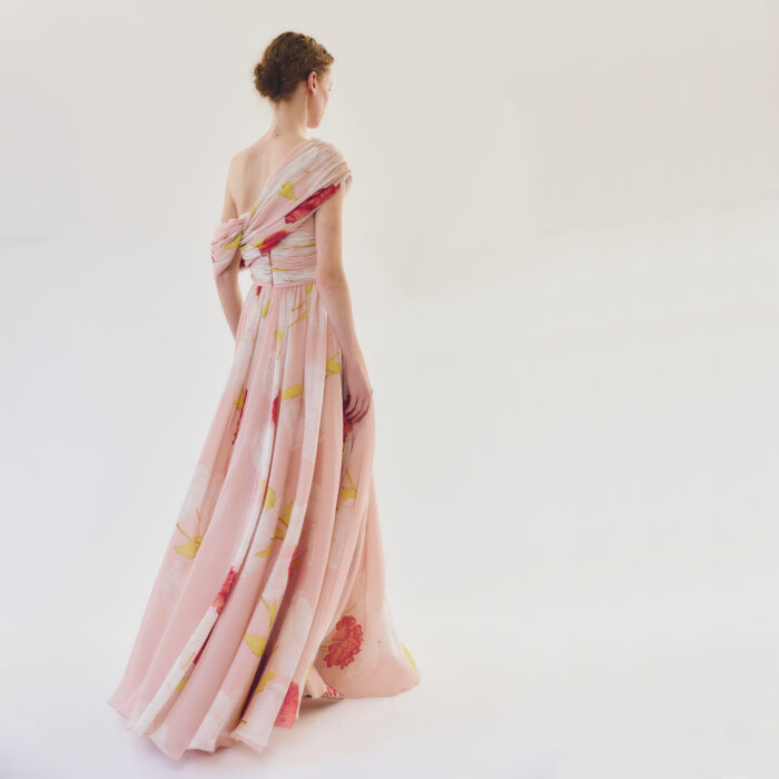 Cette robe longue asymétrique en soie rose est imprimée Blossoms. Elle présente un corset à décolleté cœur recouvert d’un drapé asymétrique fixe croisé sur le devant : une partie couvre l’épaule droite, l’autre tombe sous le coude et se fixe à l’arrière à l’aide de quatre boutons-pression. La taille est soulignée par une ceinture en dentelle rose avec un nœud central.
