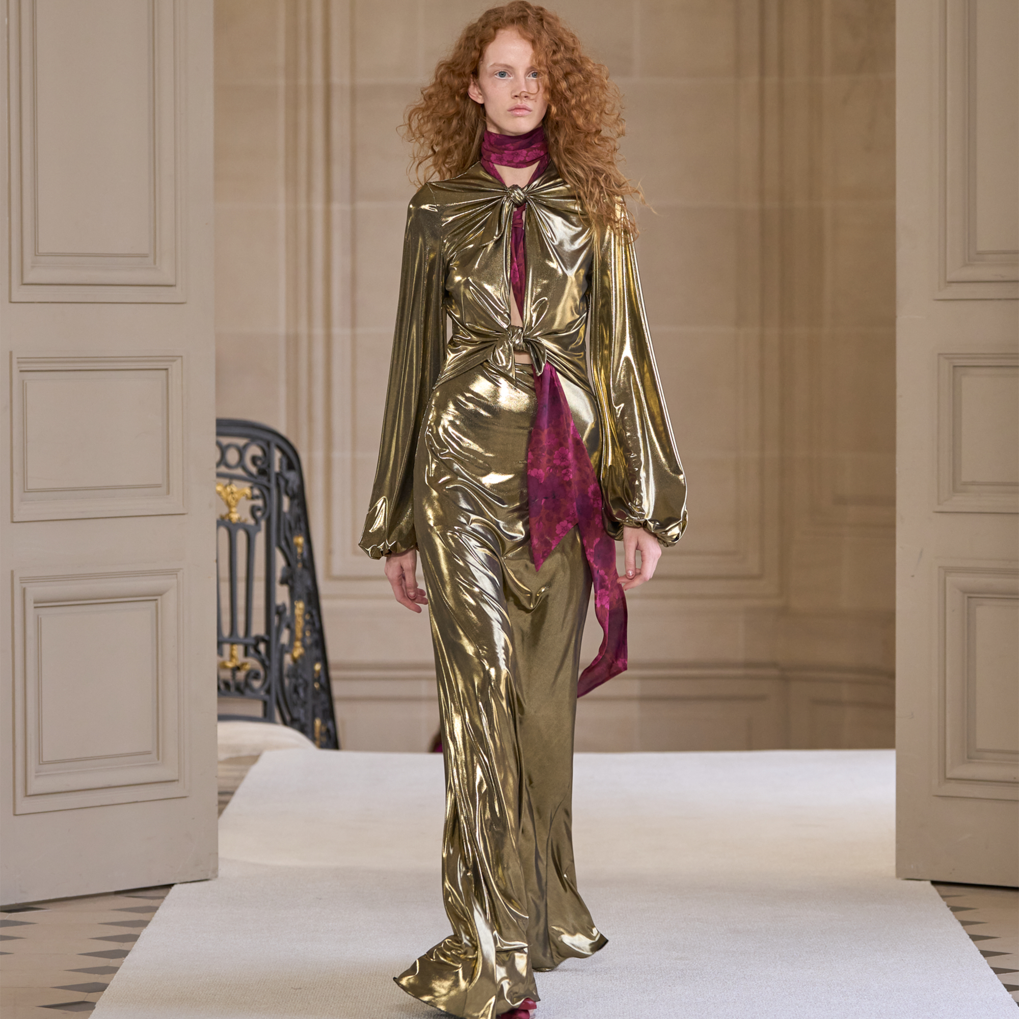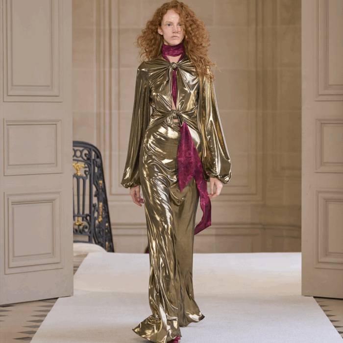 Robe longue dorée en jersey laminé avec noeuds