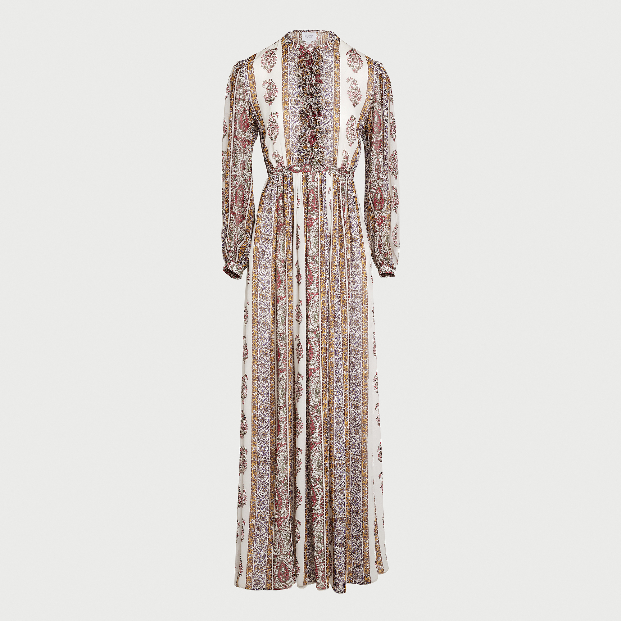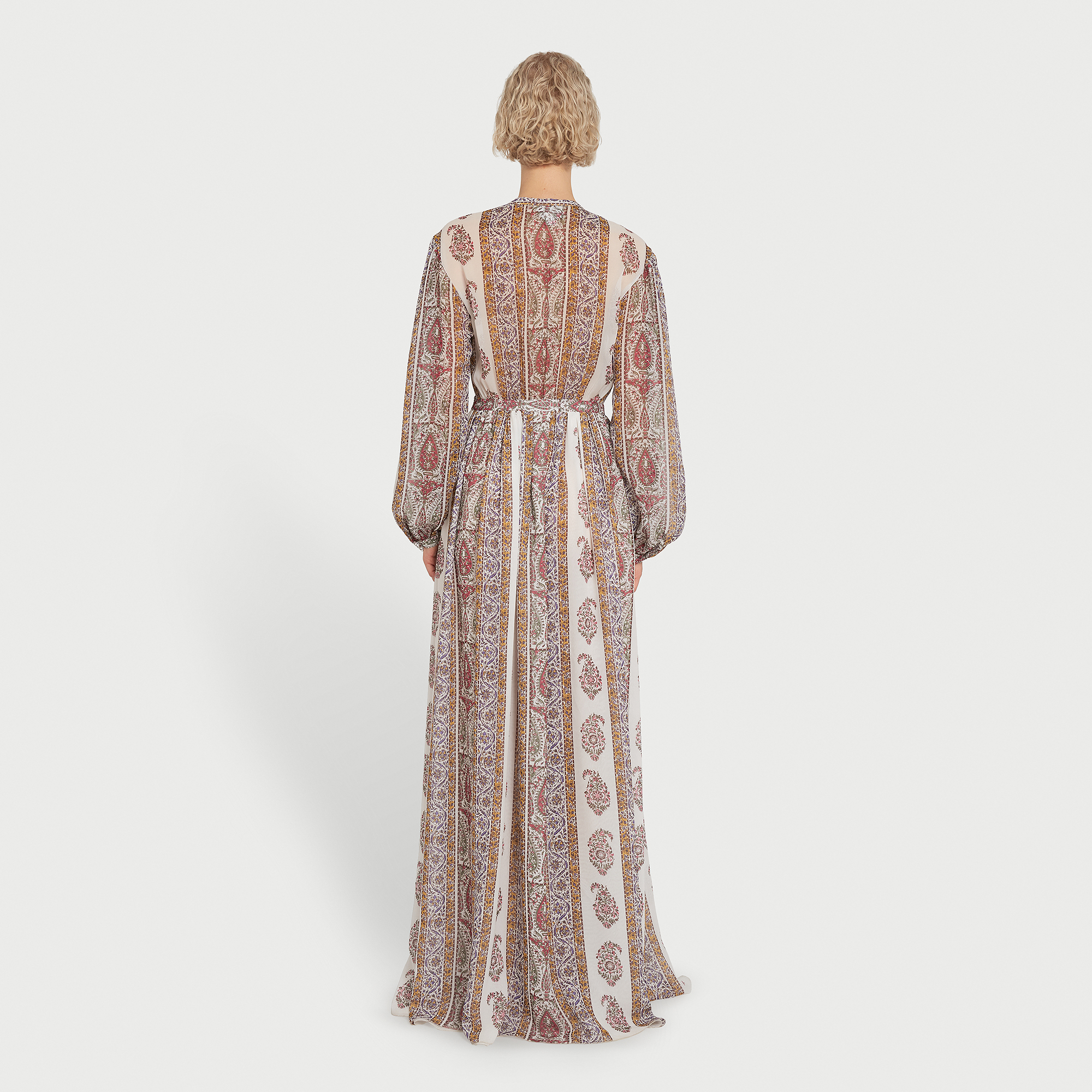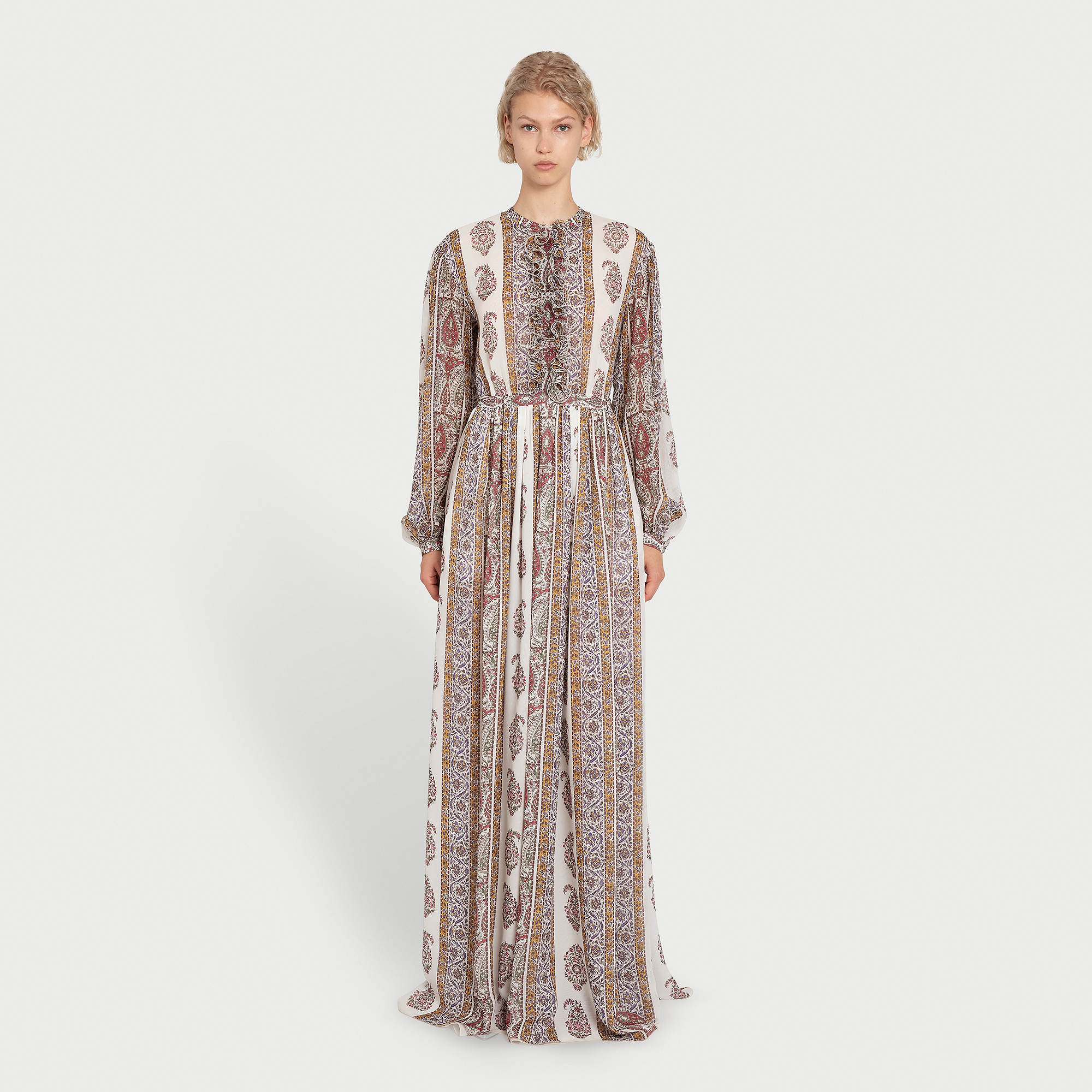 Cette robe longue en soie présente un imprimé Paisley. Elle est dotée d’un col rond, de manches longues à bouffantes avec un bouton aux poignets, de poches latérales et d’une patte de boutonnage avec cinq boutons, dont un visible.