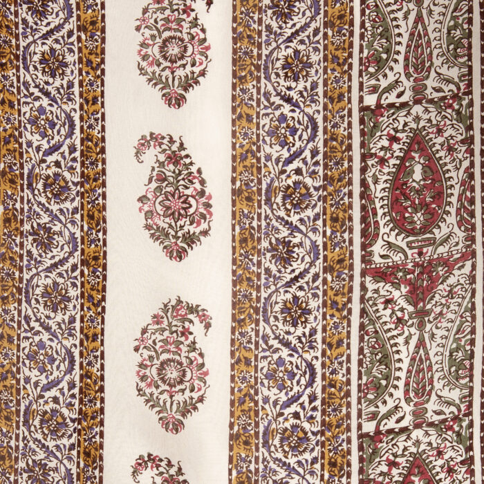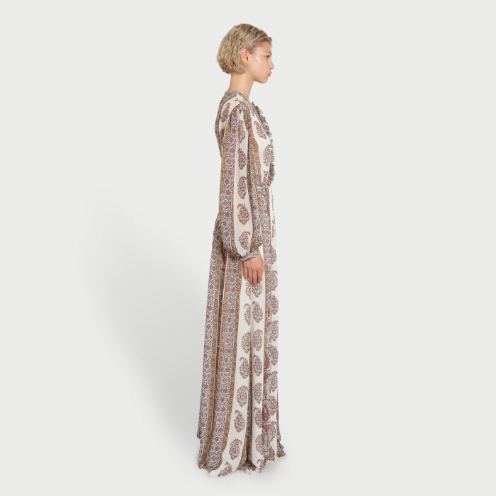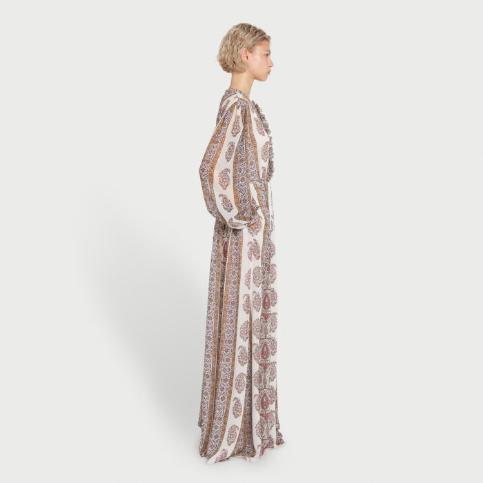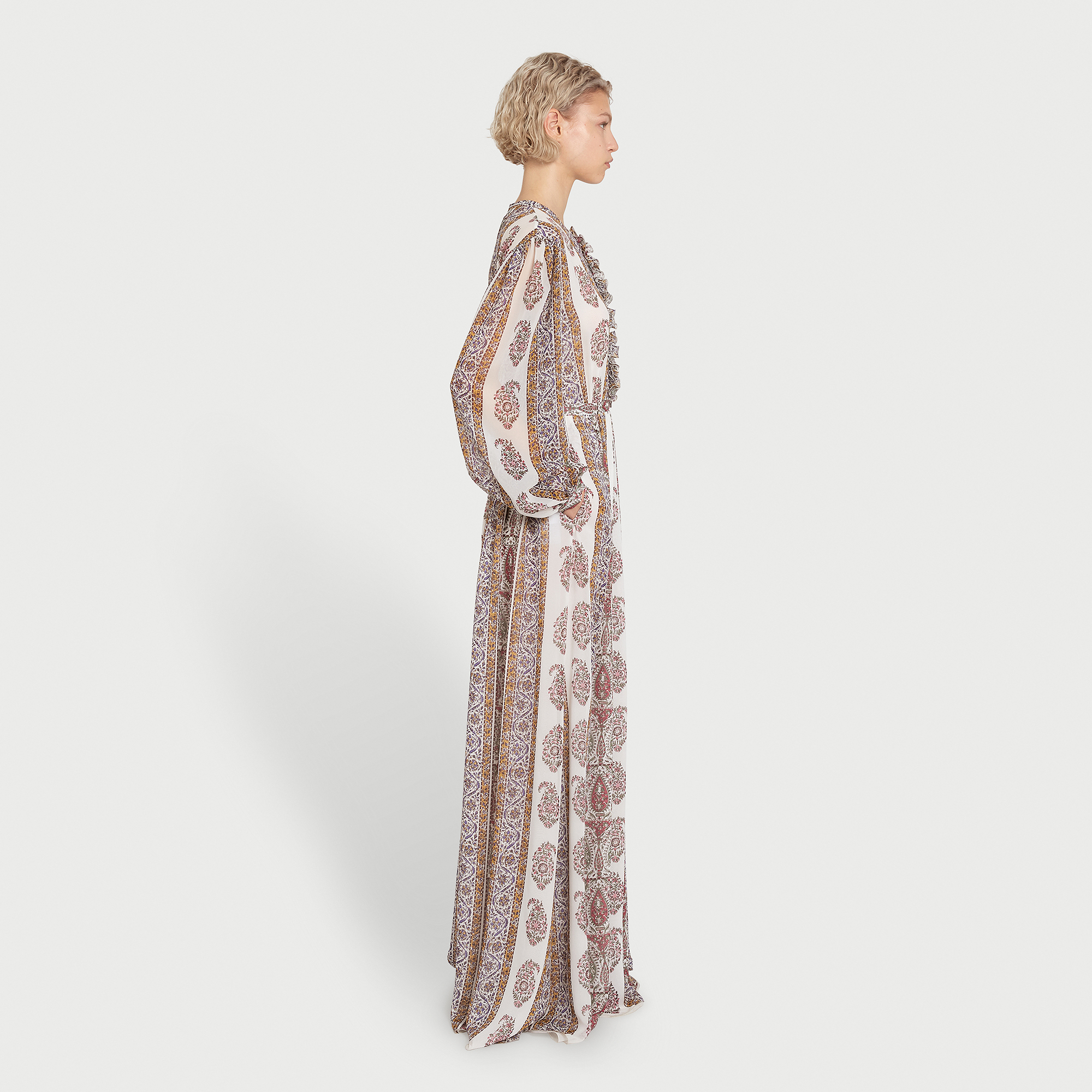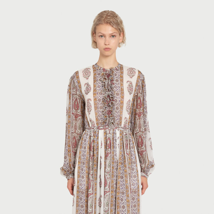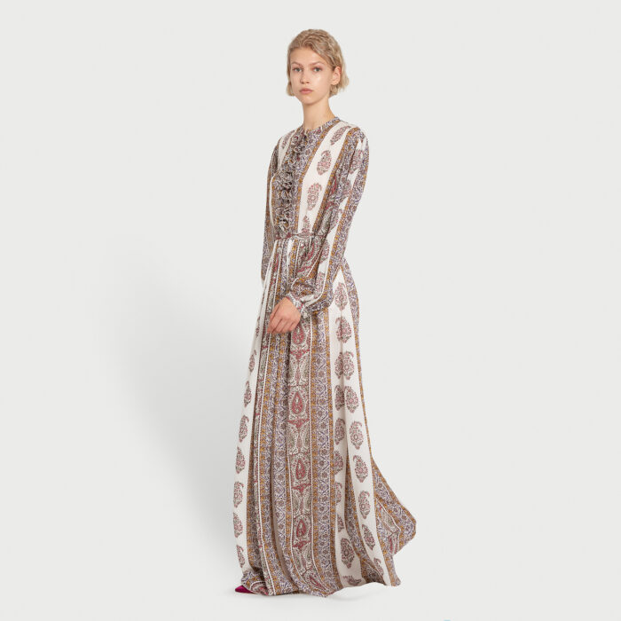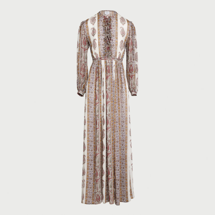Cette robe longue en soie présente un imprimé Paisley. Elle est dotée d’un col rond, de manches longues à bouffantes avec un bouton aux poignets, de poches latérales et d’une patte de boutonnage avec cinq boutons, dont un visible.