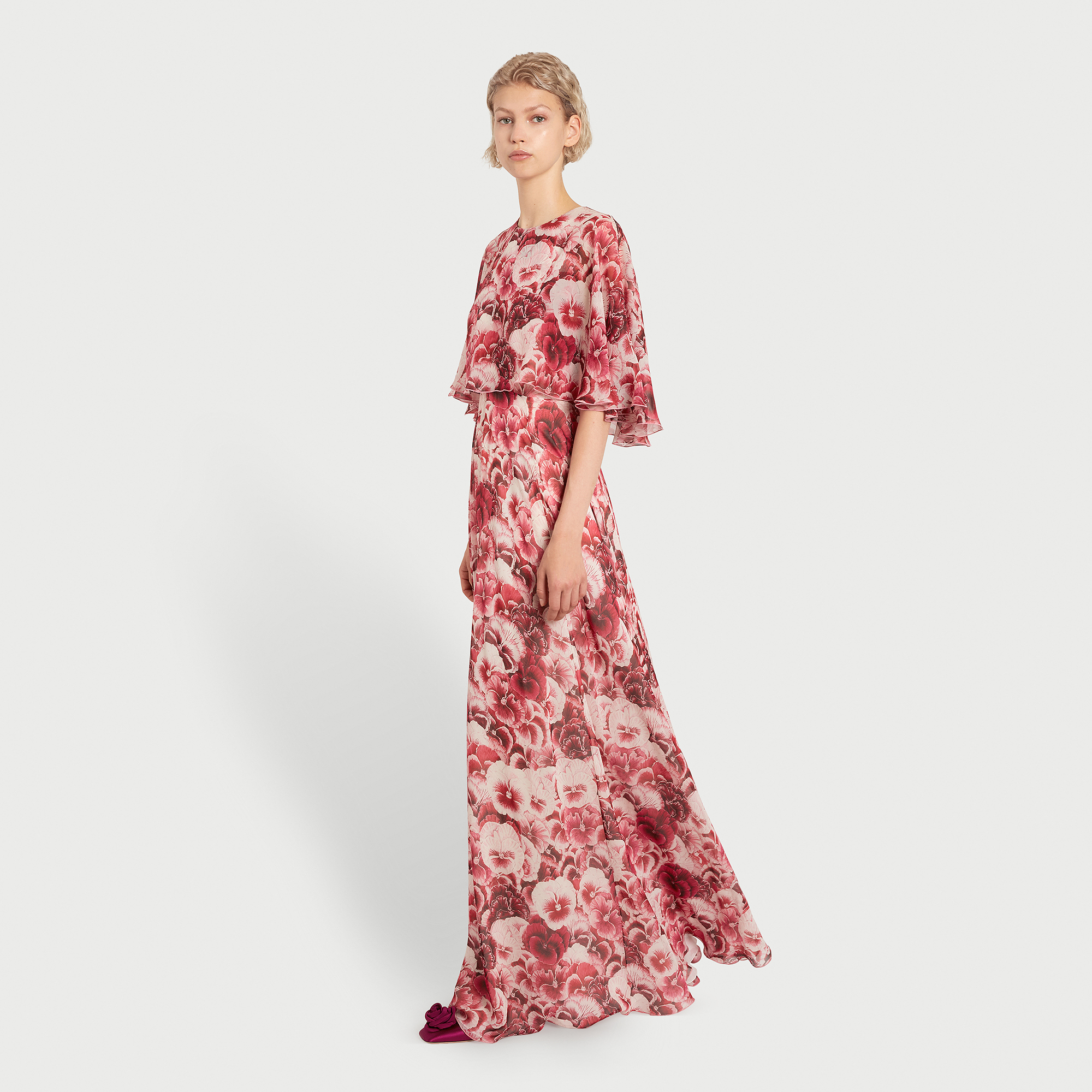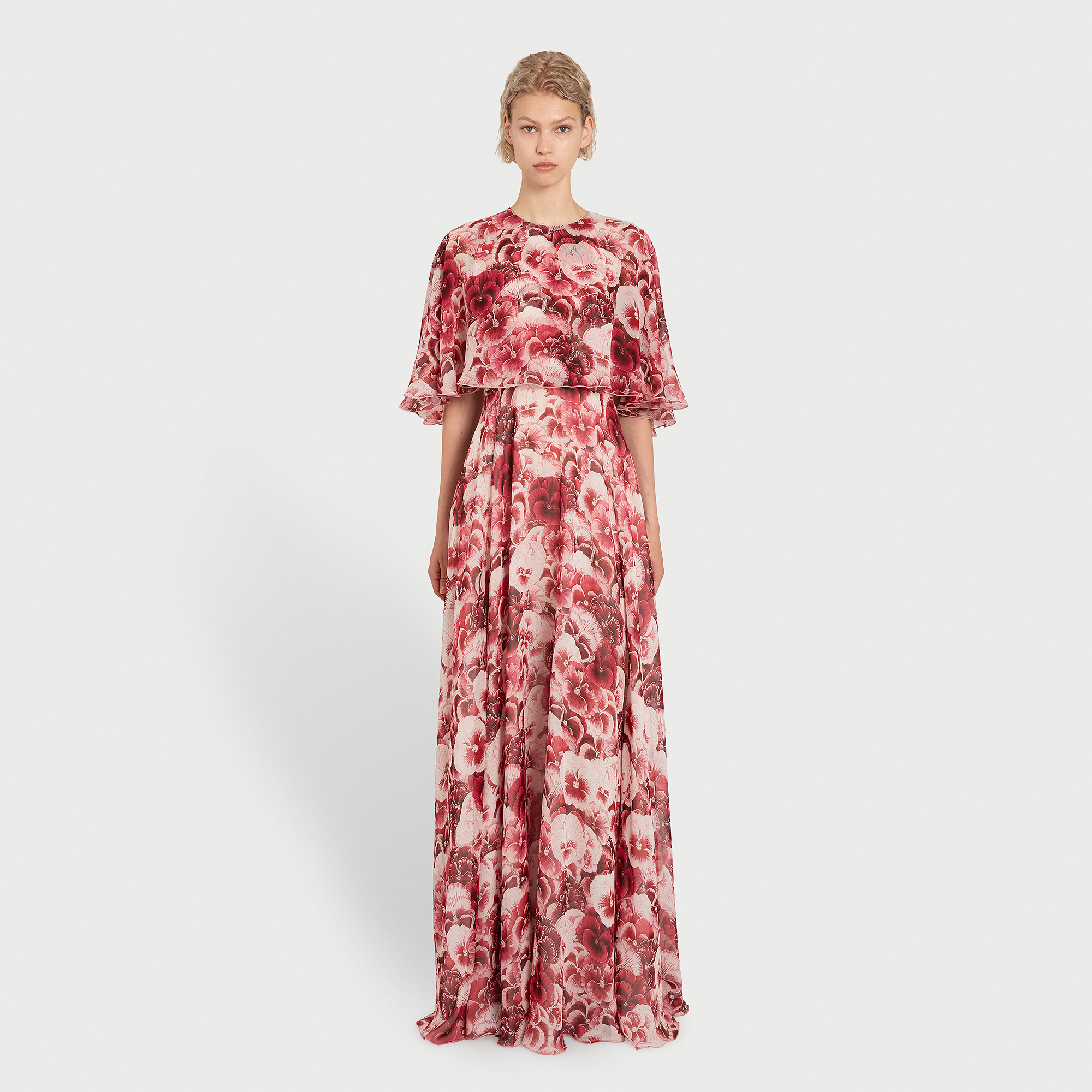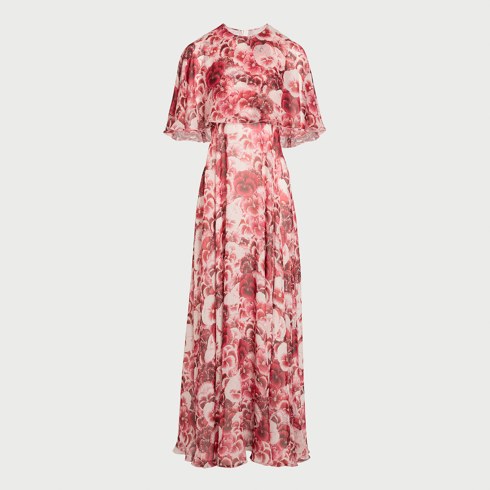 Cette robe longue en soie est imprimée Ruby Pansies. Elle se distingue par une cape fluide qui couvre élégamment les épaules.
