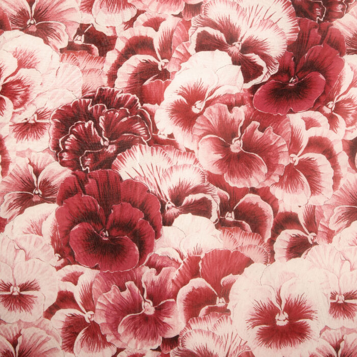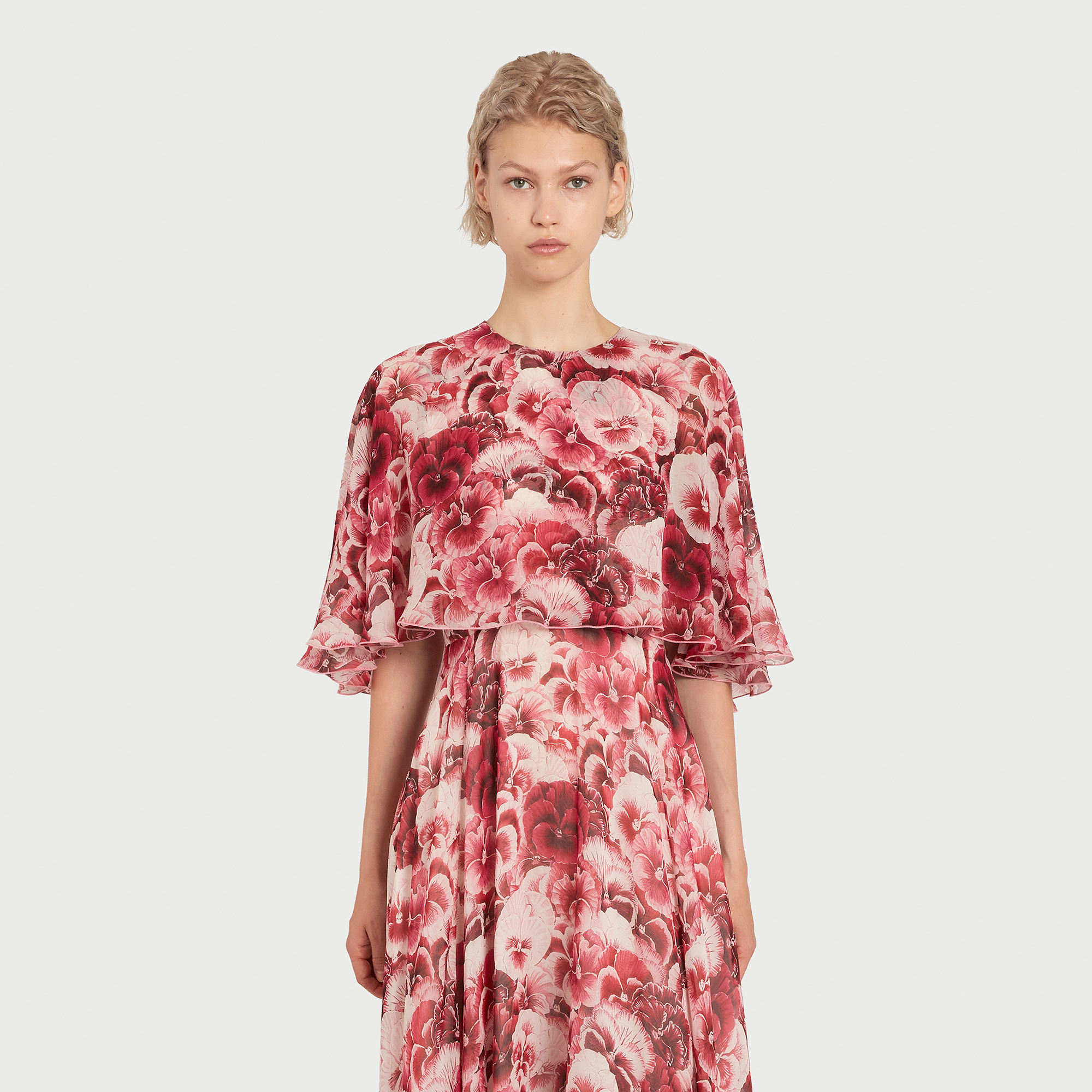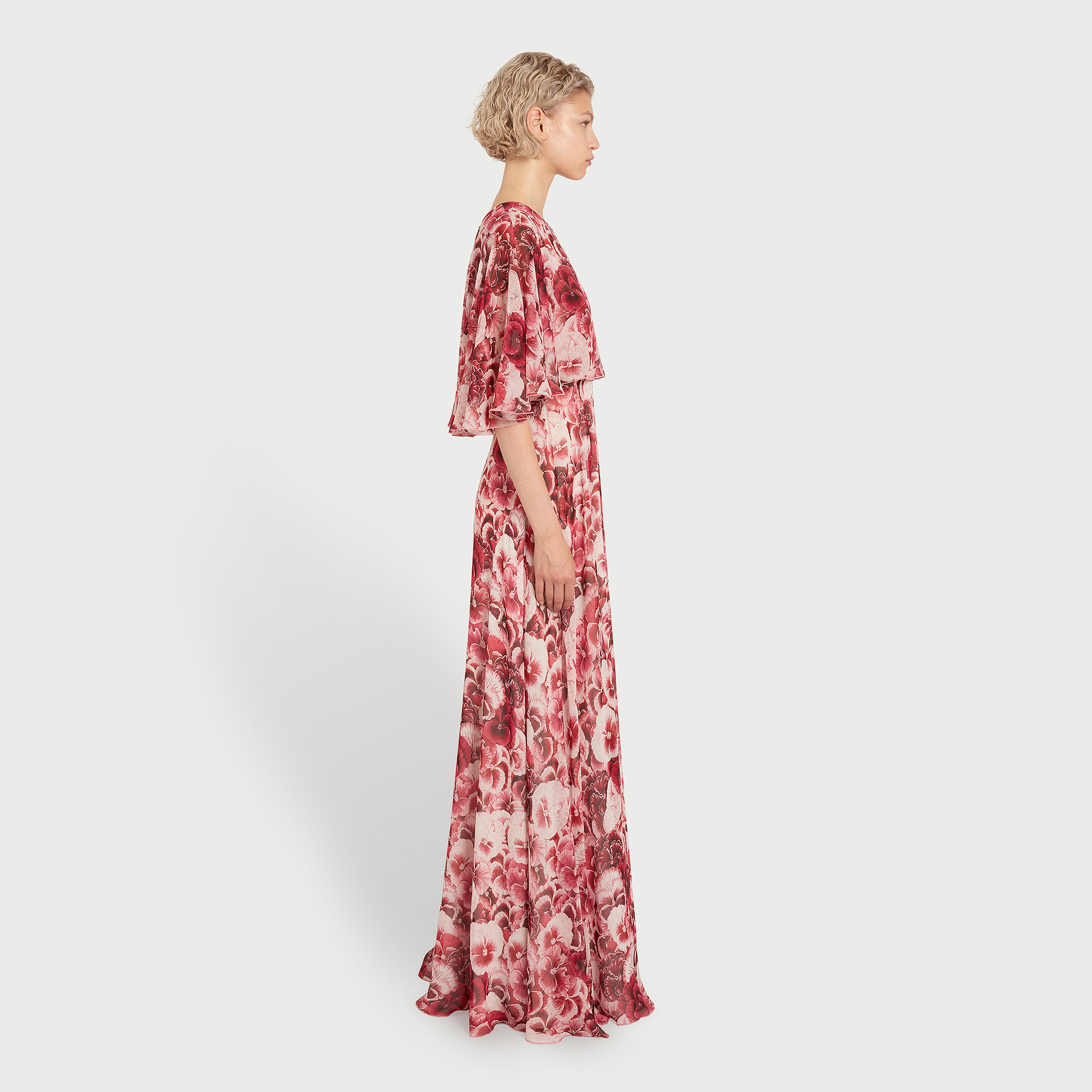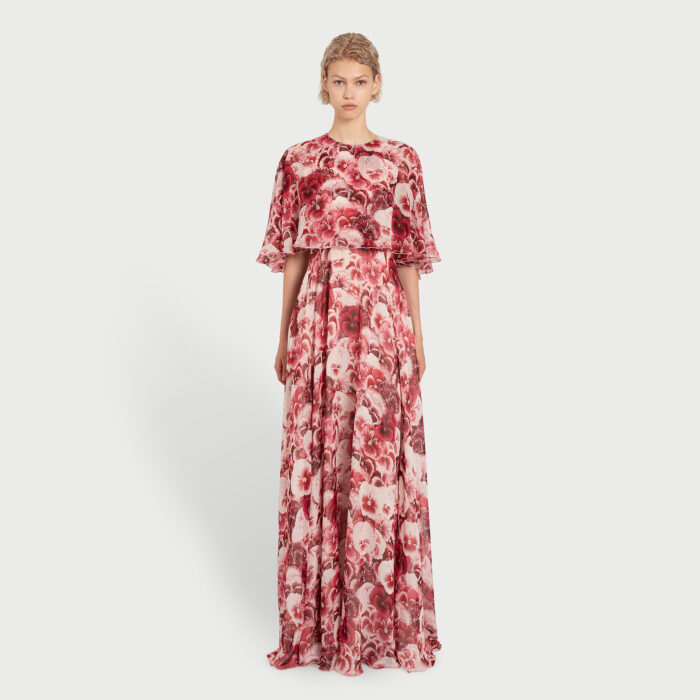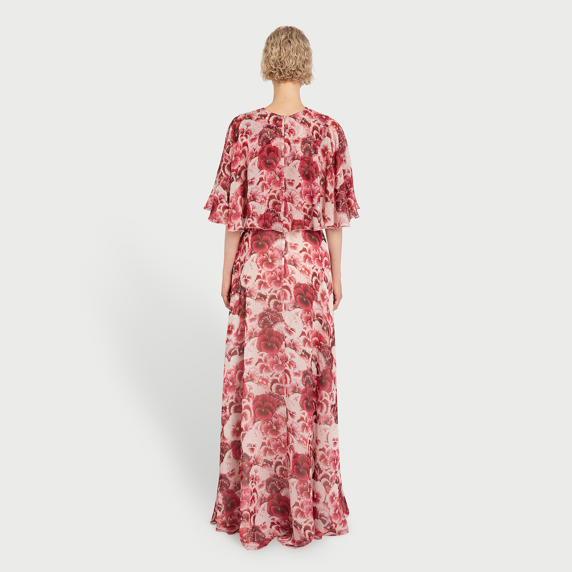 Cette robe longue en soie est imprimée Ruby Pansies. Elle se distingue par une cape fluide qui couvre élégamment les épaules.