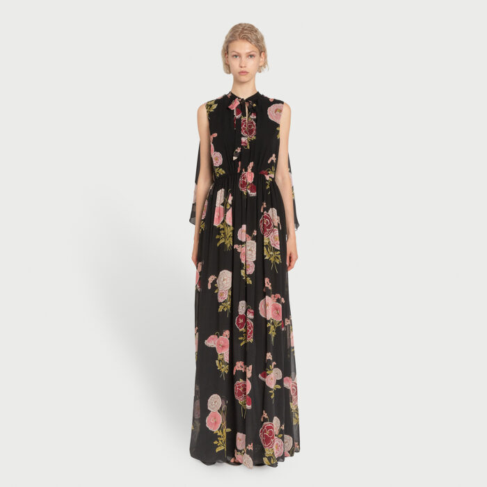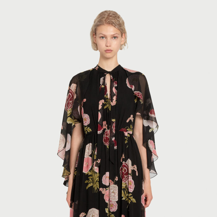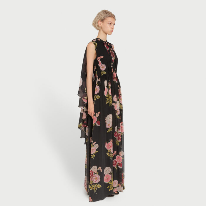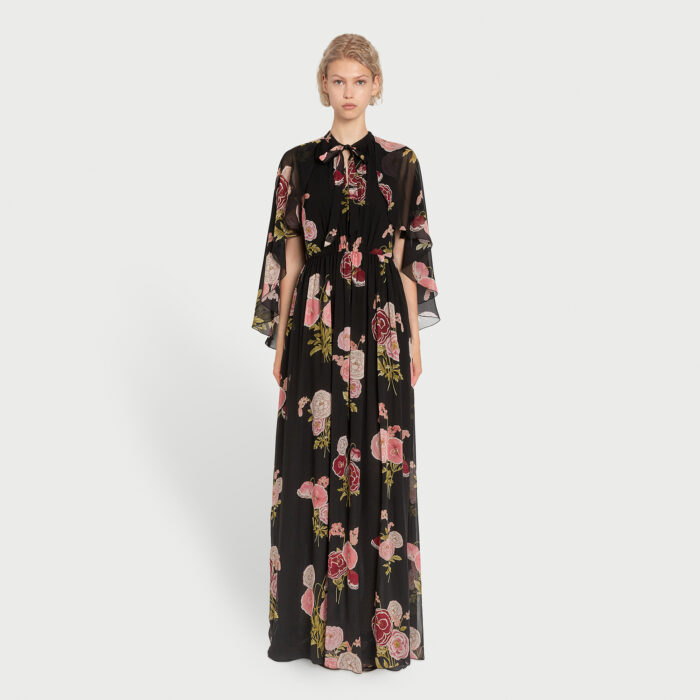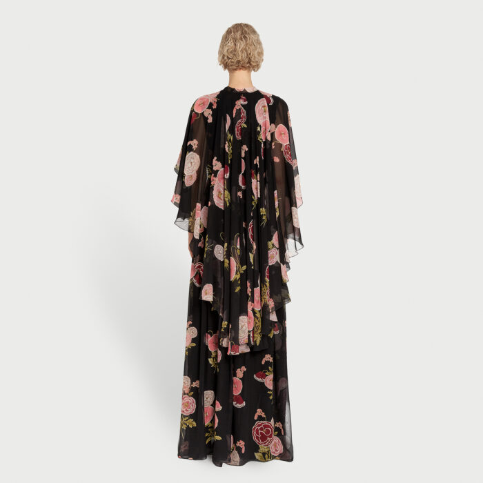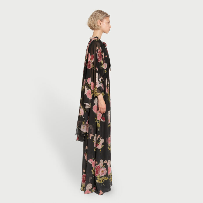 Cette robe longue noire en soie présente l’imprimé Pansies. Elle est dotée de manches cape, d’un col lavallière et d’une jupe fluide.