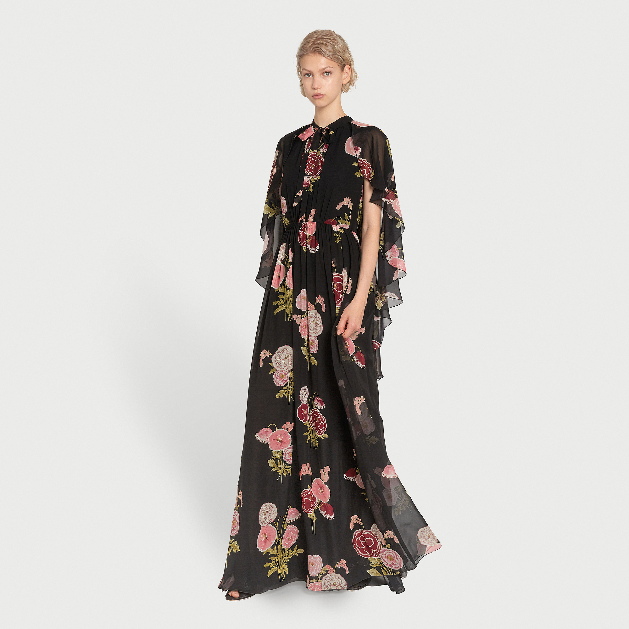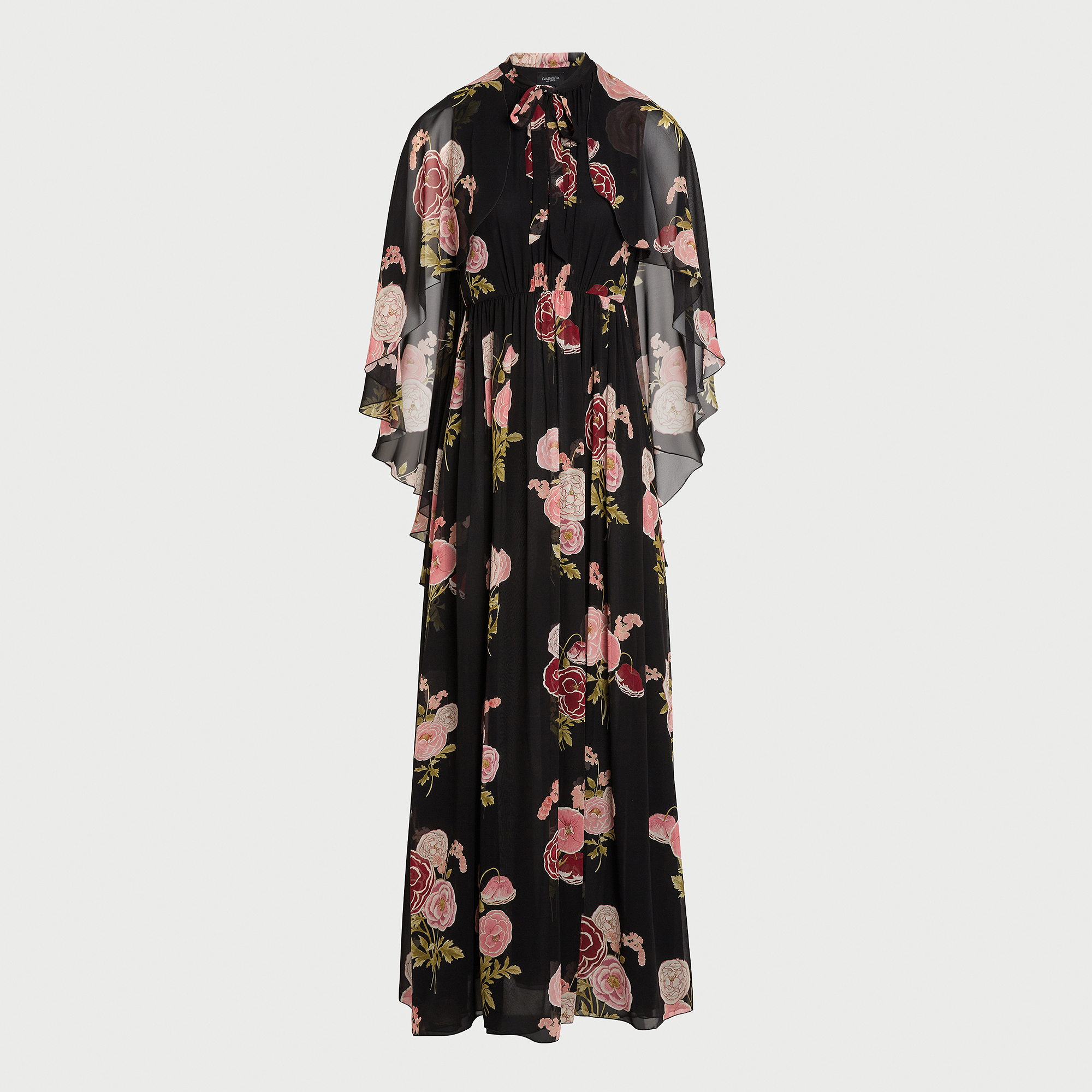 Cette robe longue noire en soie présente l’imprimé Pansies. Elle est dotée de manches cape, d’un col lavallière et d’une jupe fluide.