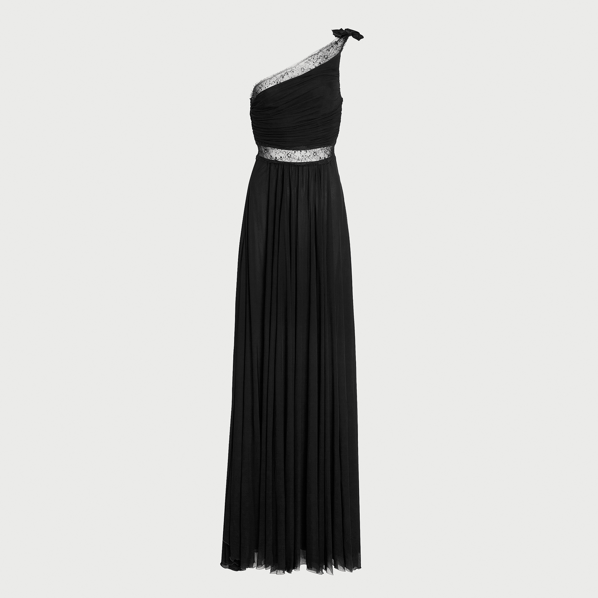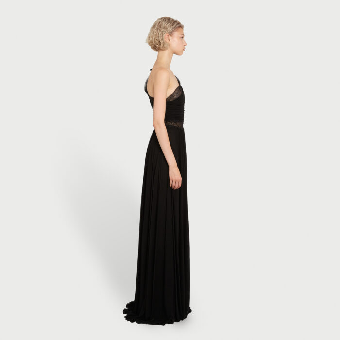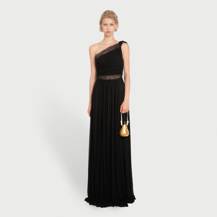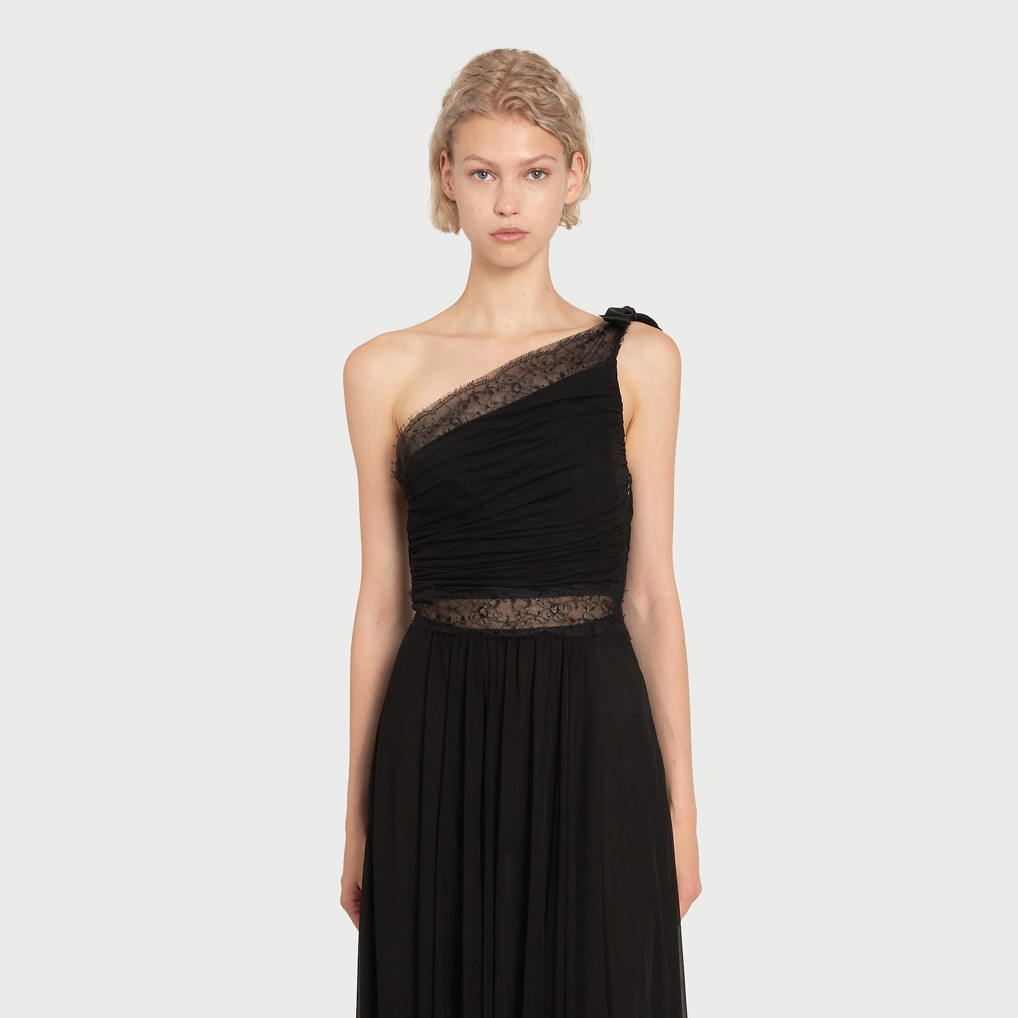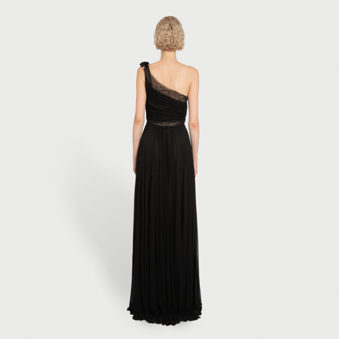 Cette longue robe asymétrique noire présente un décolleté. L’épaule gauche est bordé de dentelle noire et d’un nœud en satin. La taille, cintrée, est elle aussi ornée d’une bande en dentelle noire voilée qui relie le corsage à une jupe fluide.