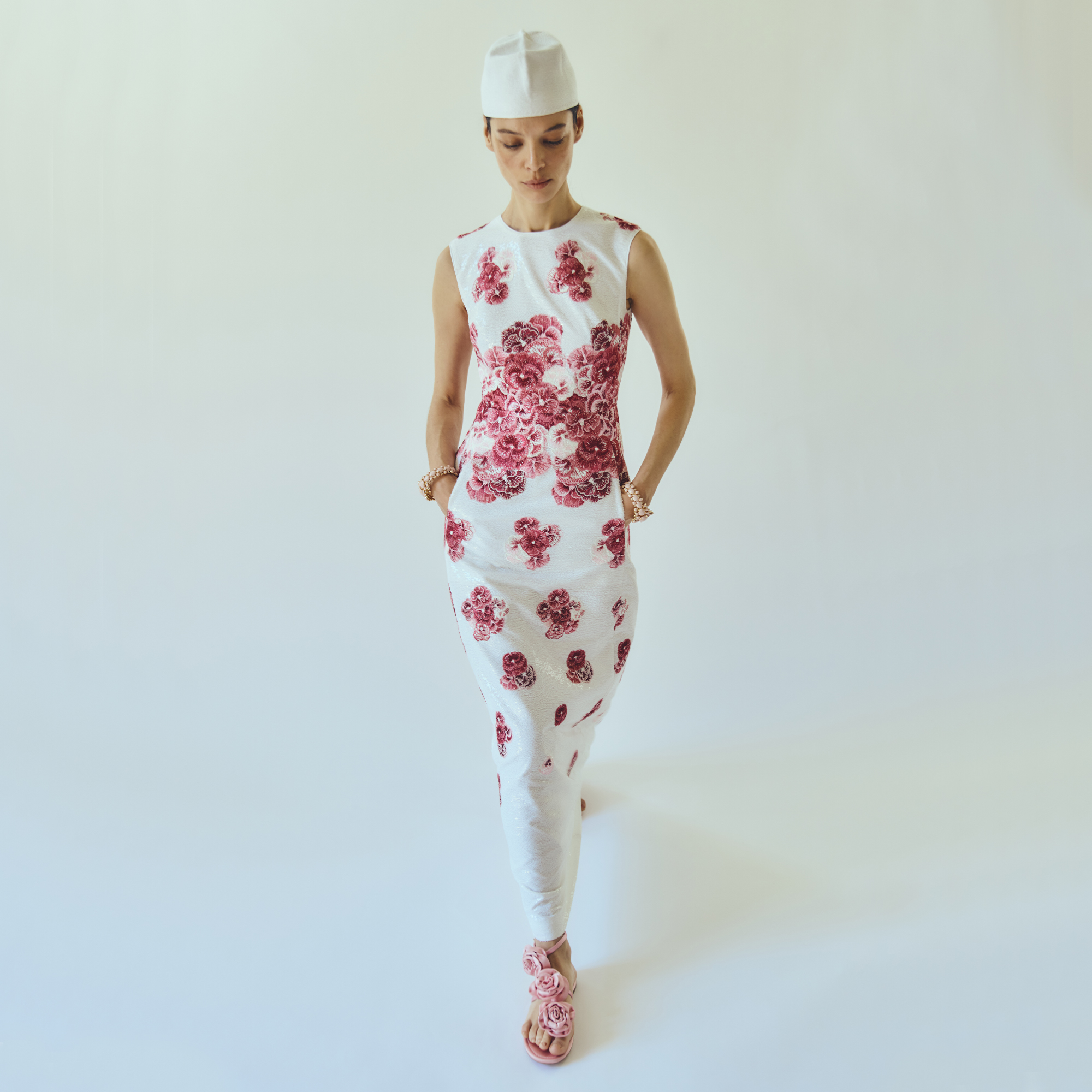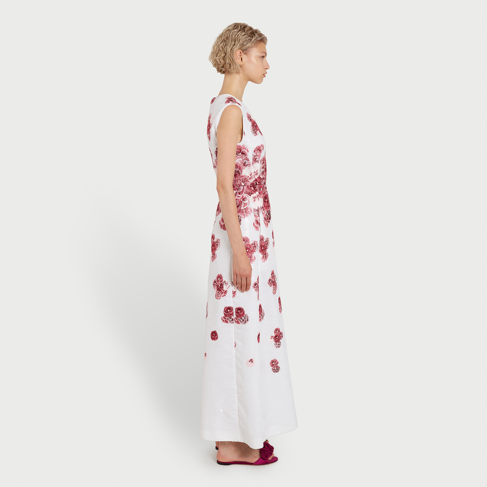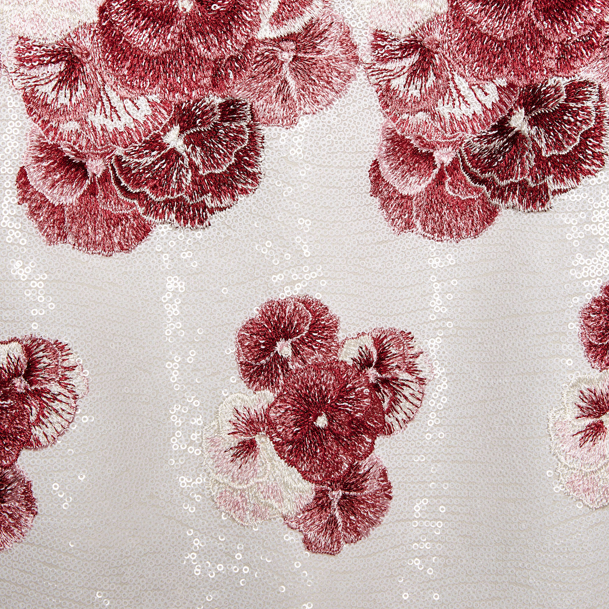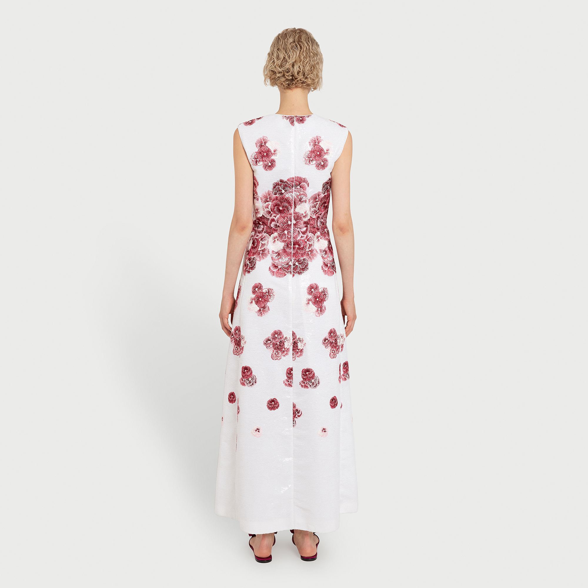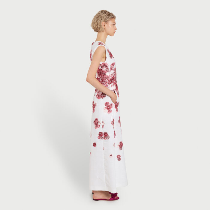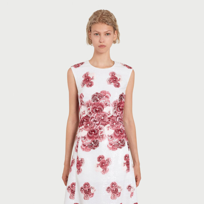 Cette robe midi ivoire à sequins présente une silhouette évasée et est brodée du motif Ruby Pansies.