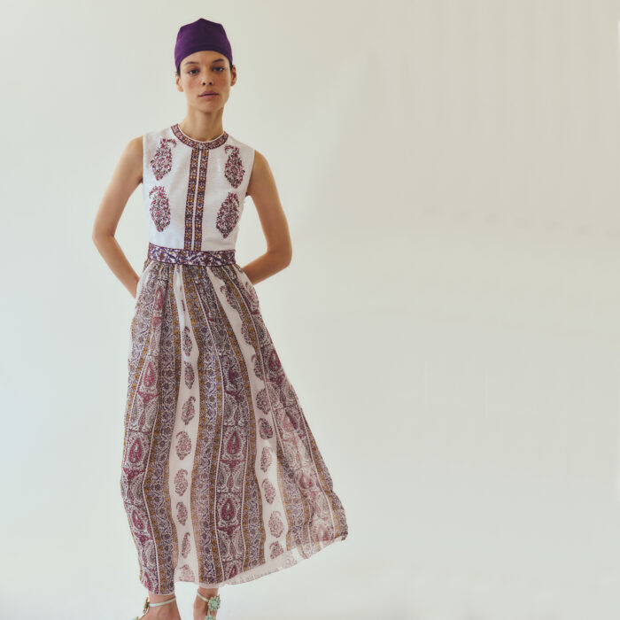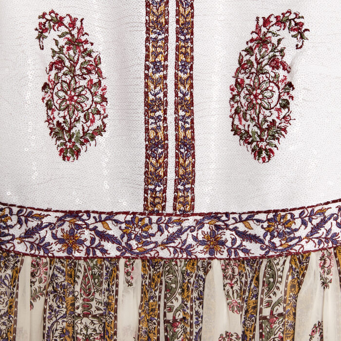 Cette robe midi sans manches associe un corsage entièrement orné de sequins à une jupe en soie légère imprimée du motif Paisley. La silhouette est cintrée à la taille et agrémentée de poches latérales.