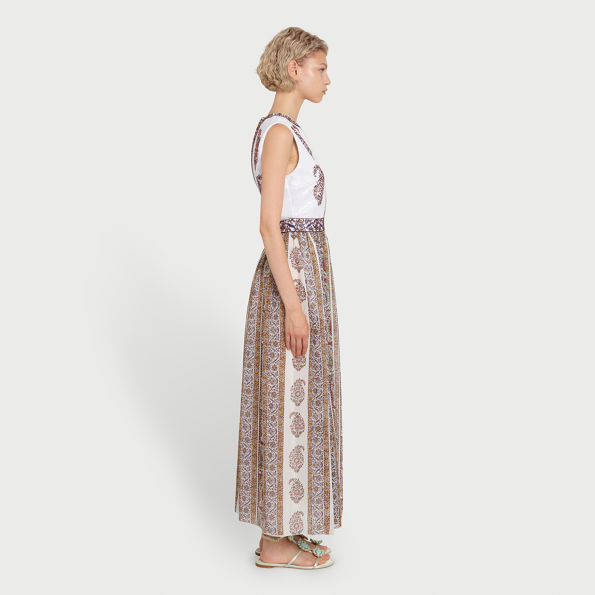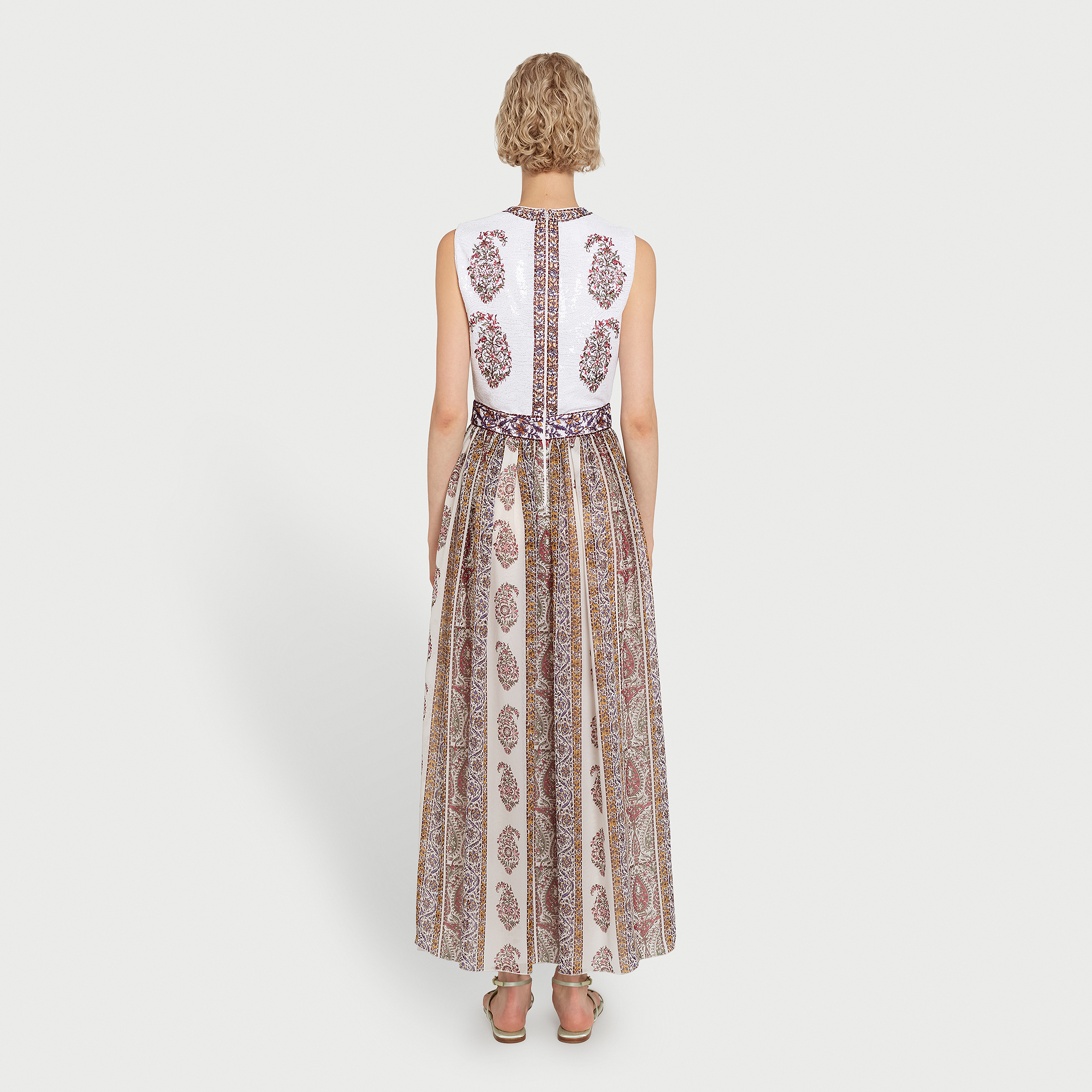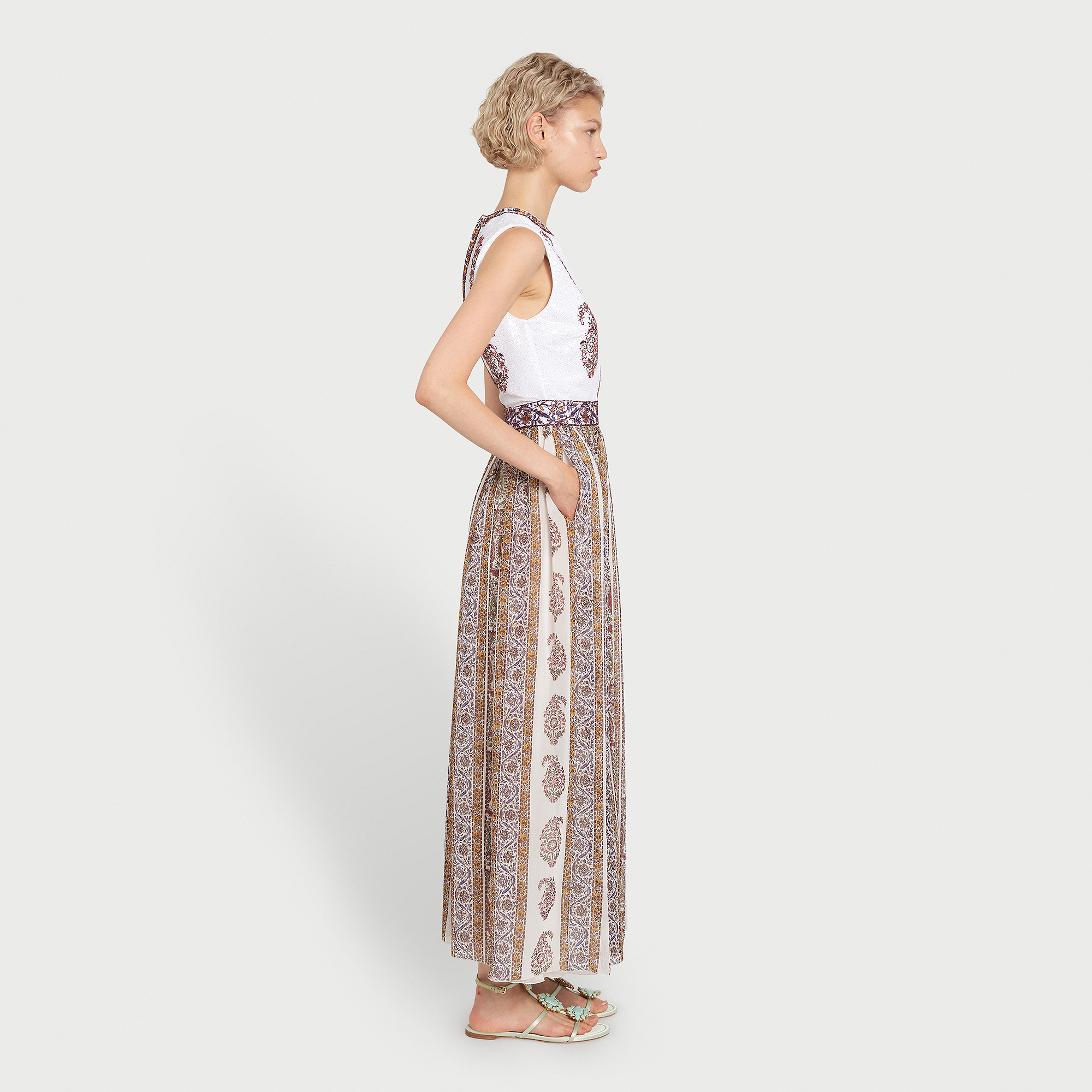 Cette robe midi sans manches associe un corsage entièrement orné de sequins à une jupe en soie légère imprimée du motif Paisley. La silhouette est cintrée à la taille et agrémentée de poches latérales.