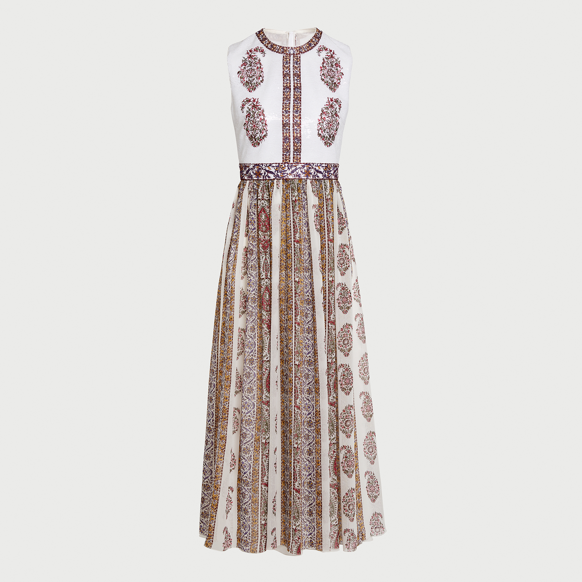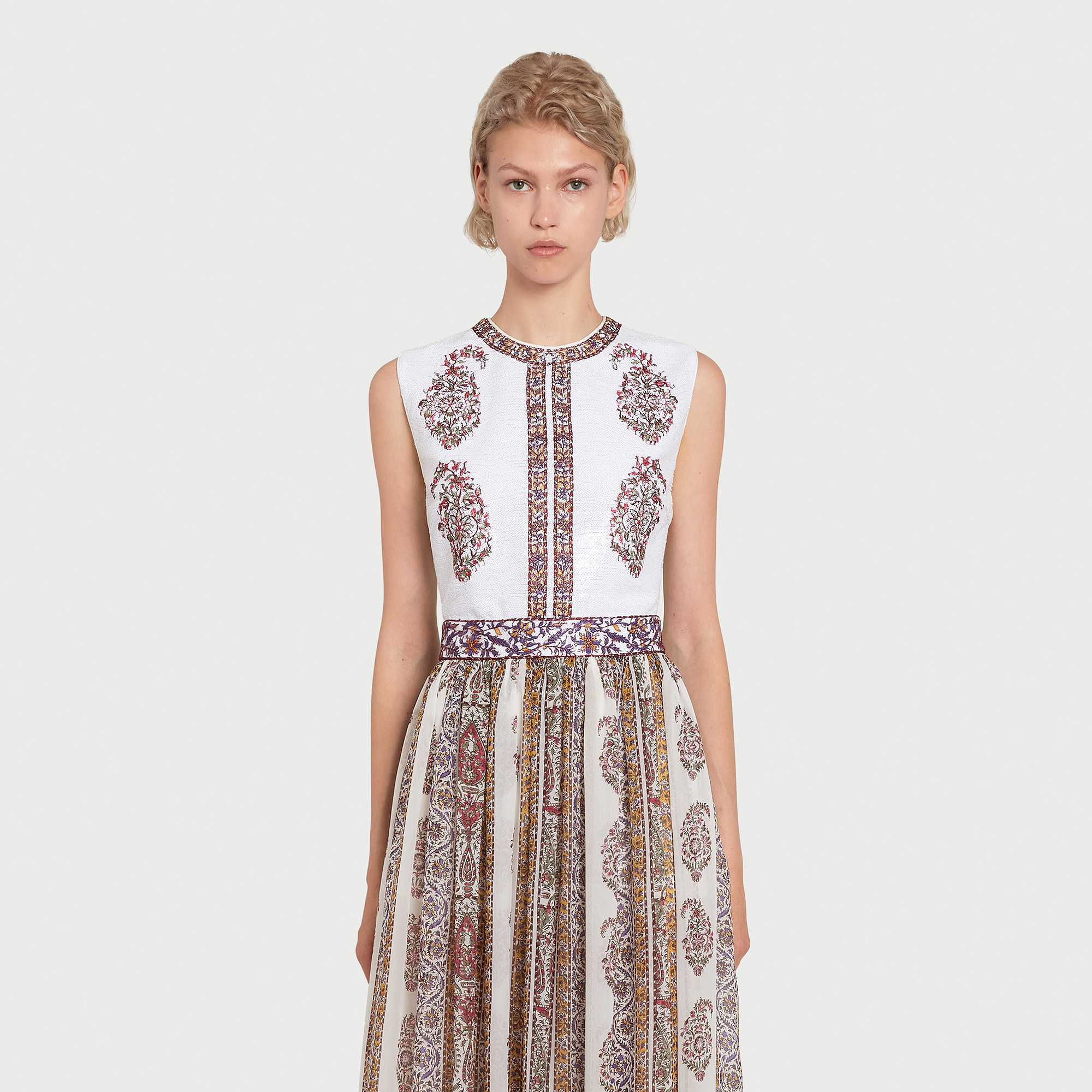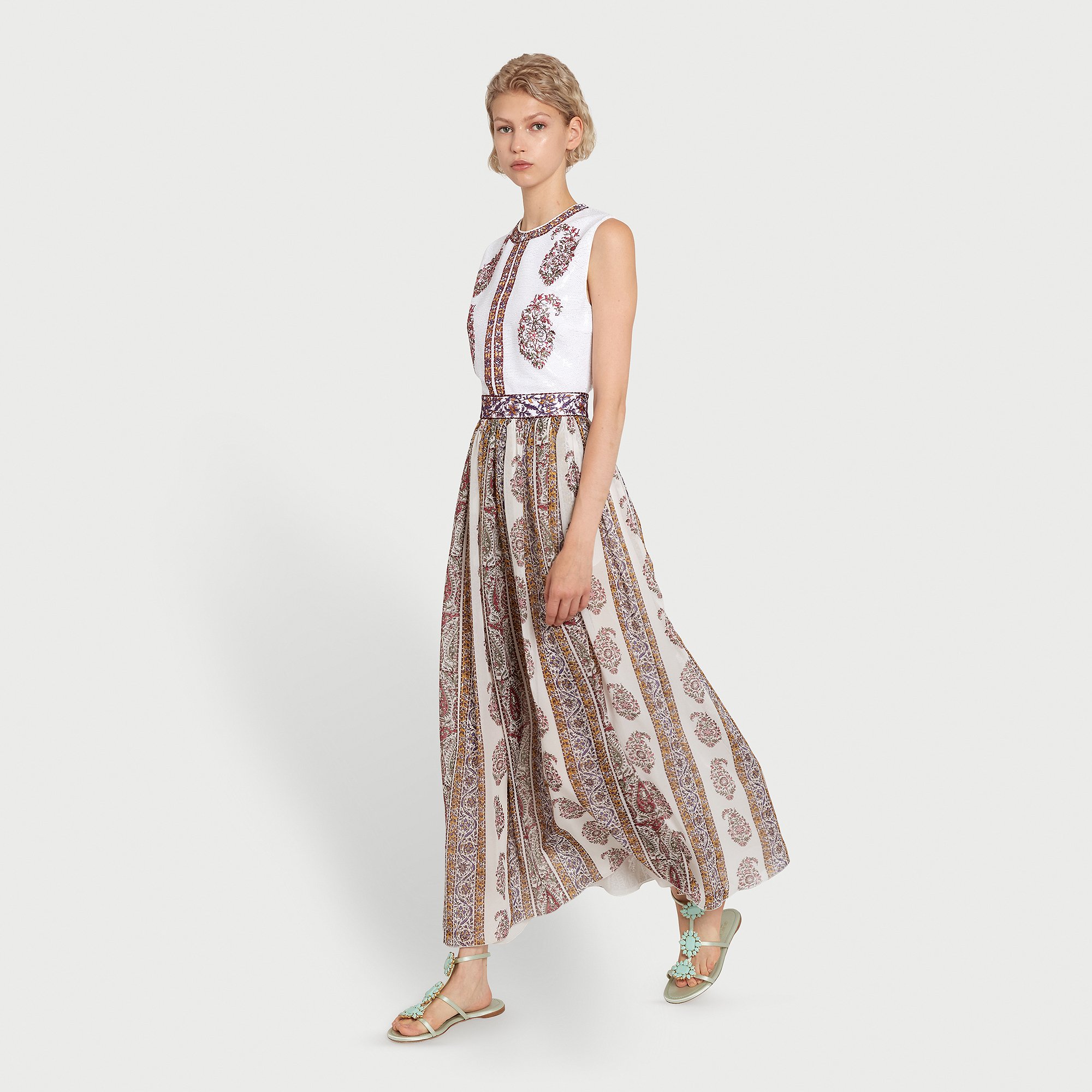 Cette robe midi sans manches associe un corsage entièrement orné de sequins à une jupe en soie légère imprimée du motif Paisley. La silhouette est cintrée à la taille et agrémentée de poches latérales.