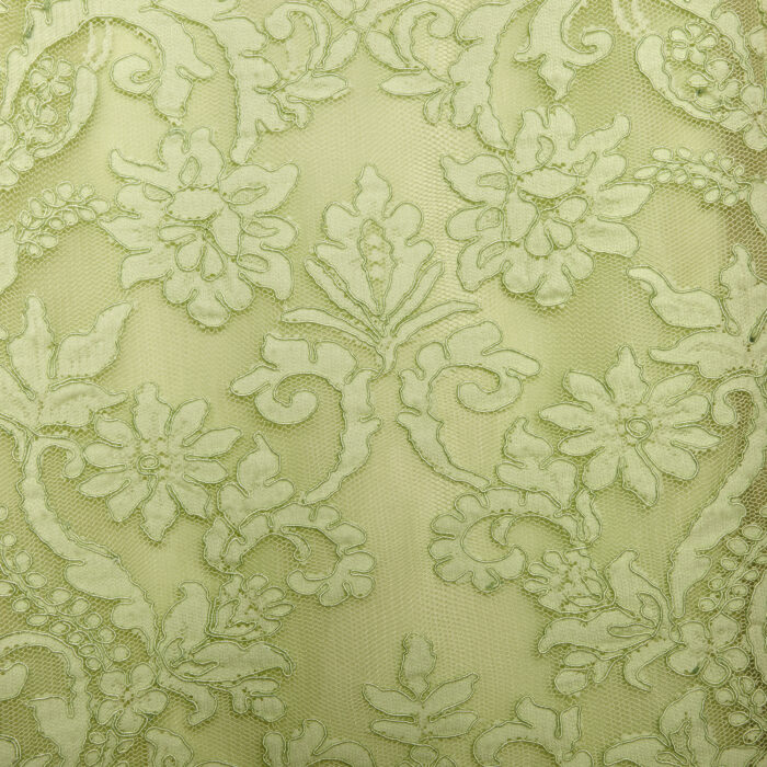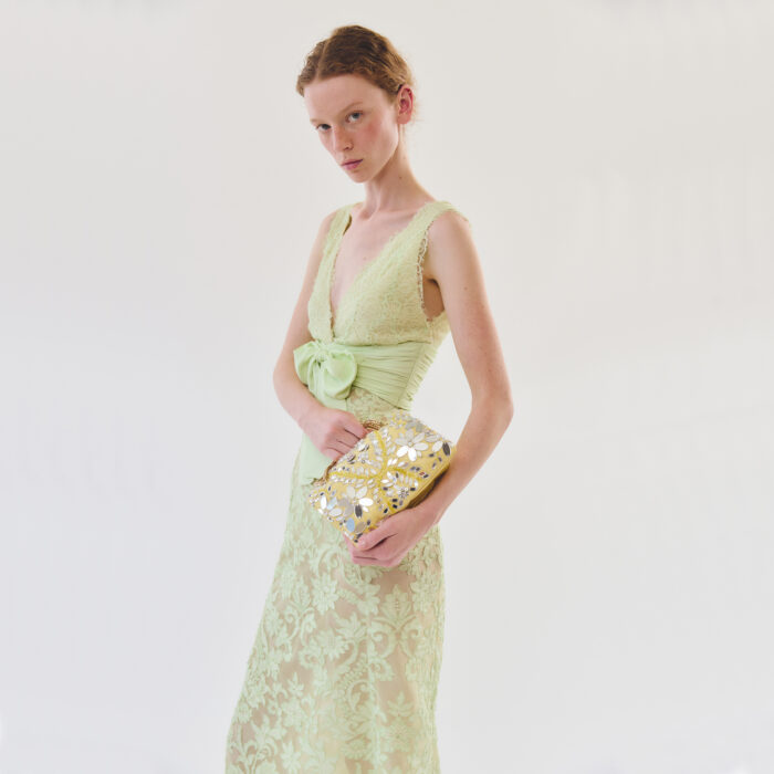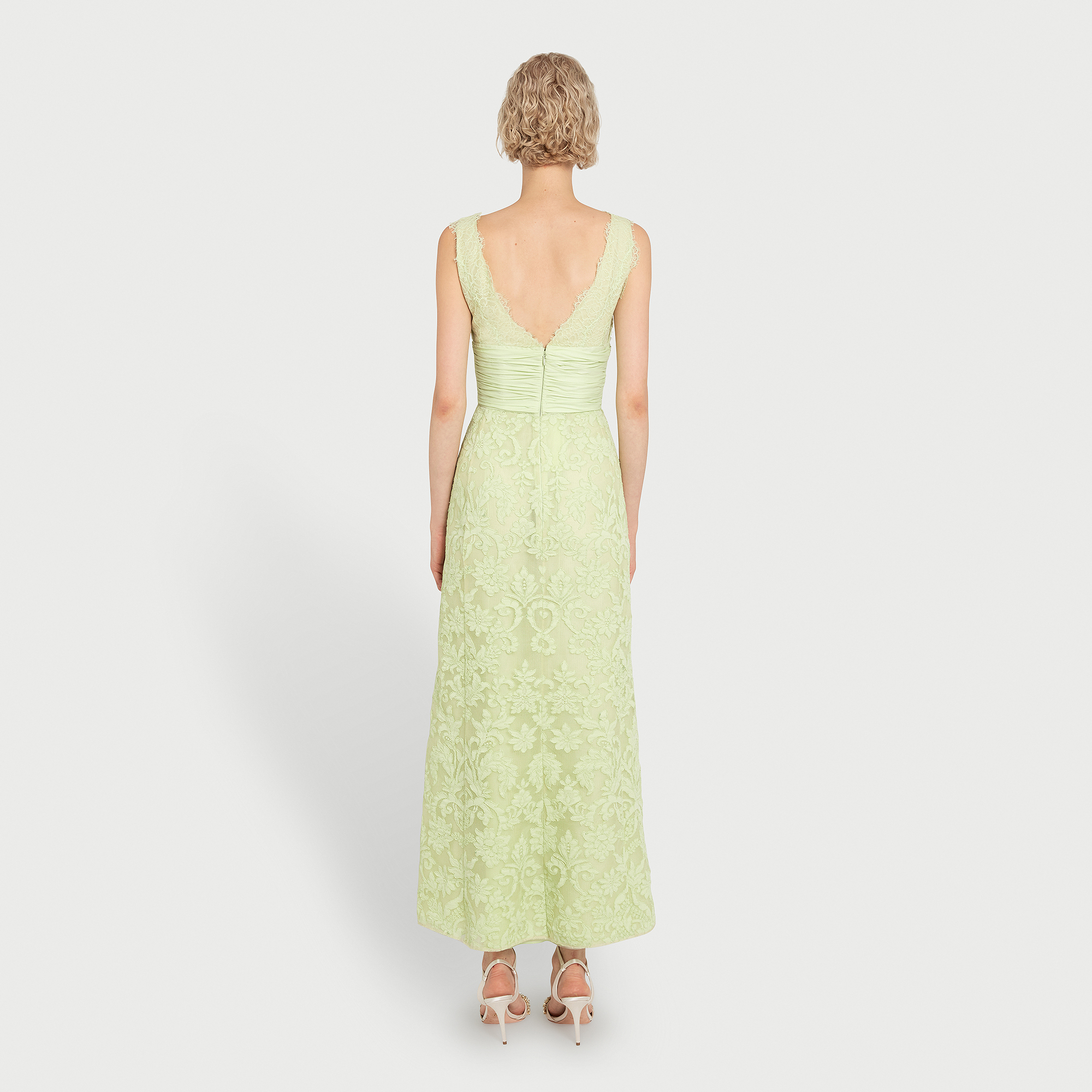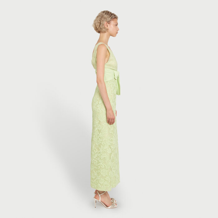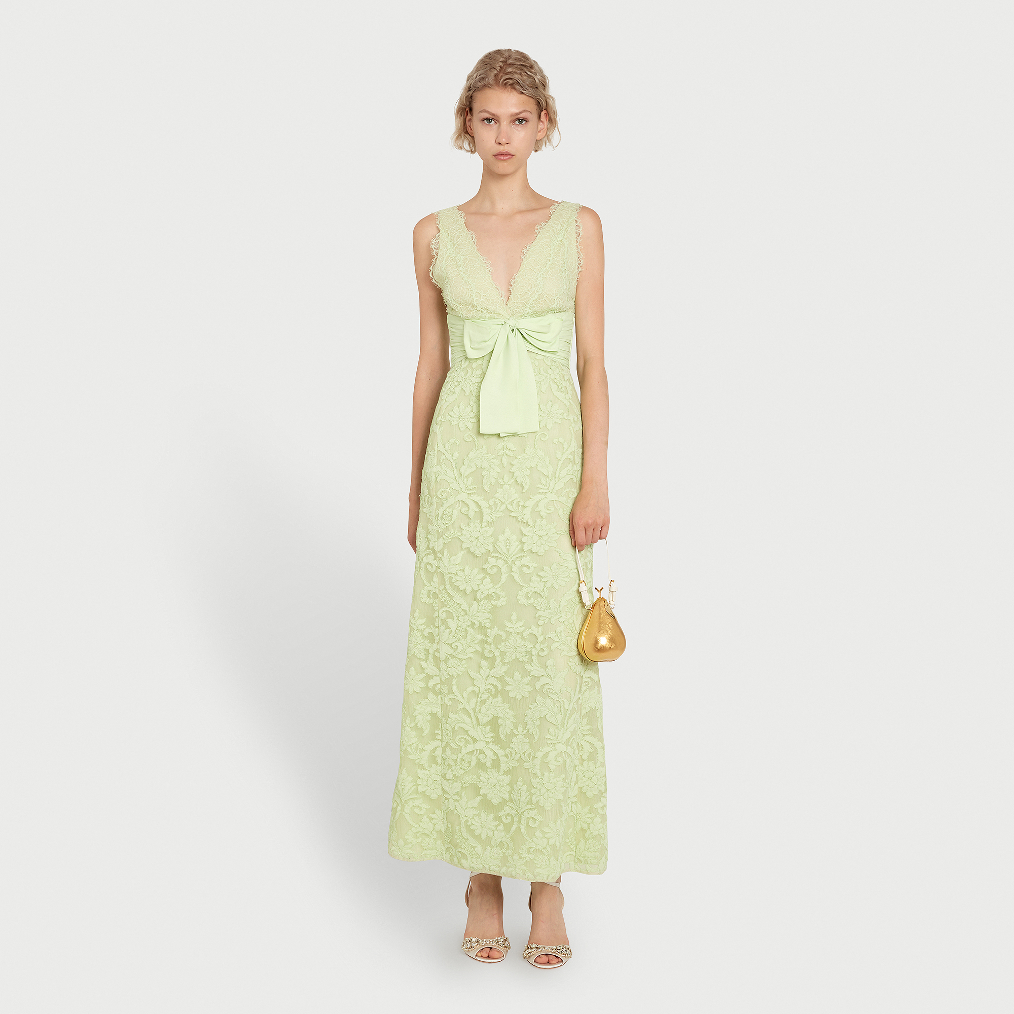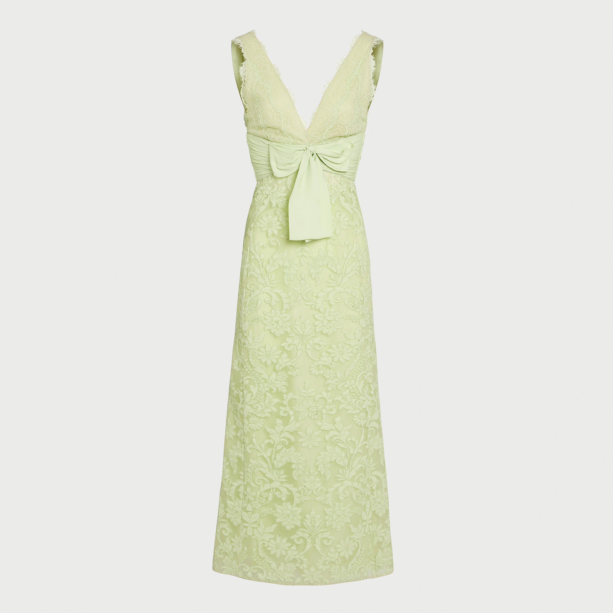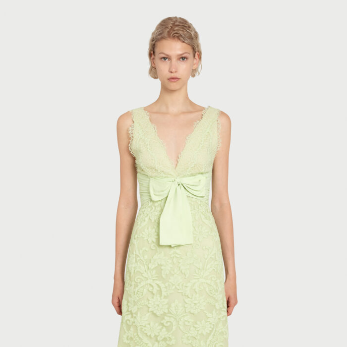 Cette robe midi verte en dentelle brodée présente une silhouette ajustée à la taille et fluide dans la jupe, avec un décolleté plongeant orné d’un nœud central et d’une ceinture enveloppante à la taille.