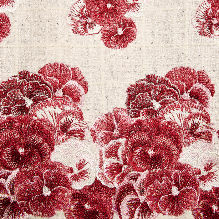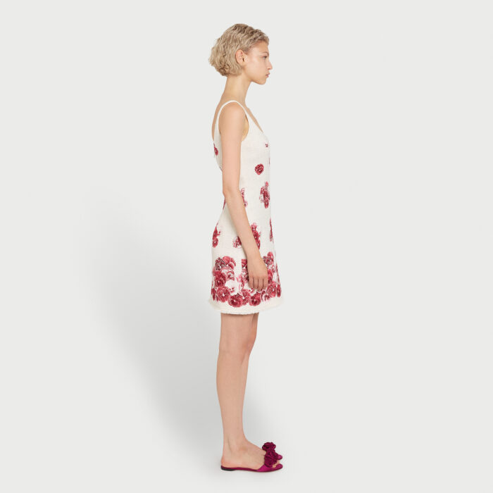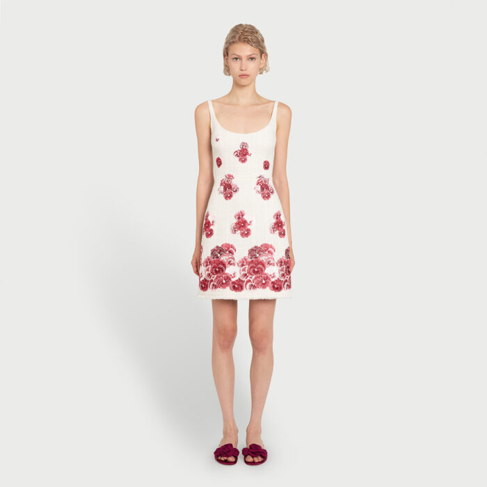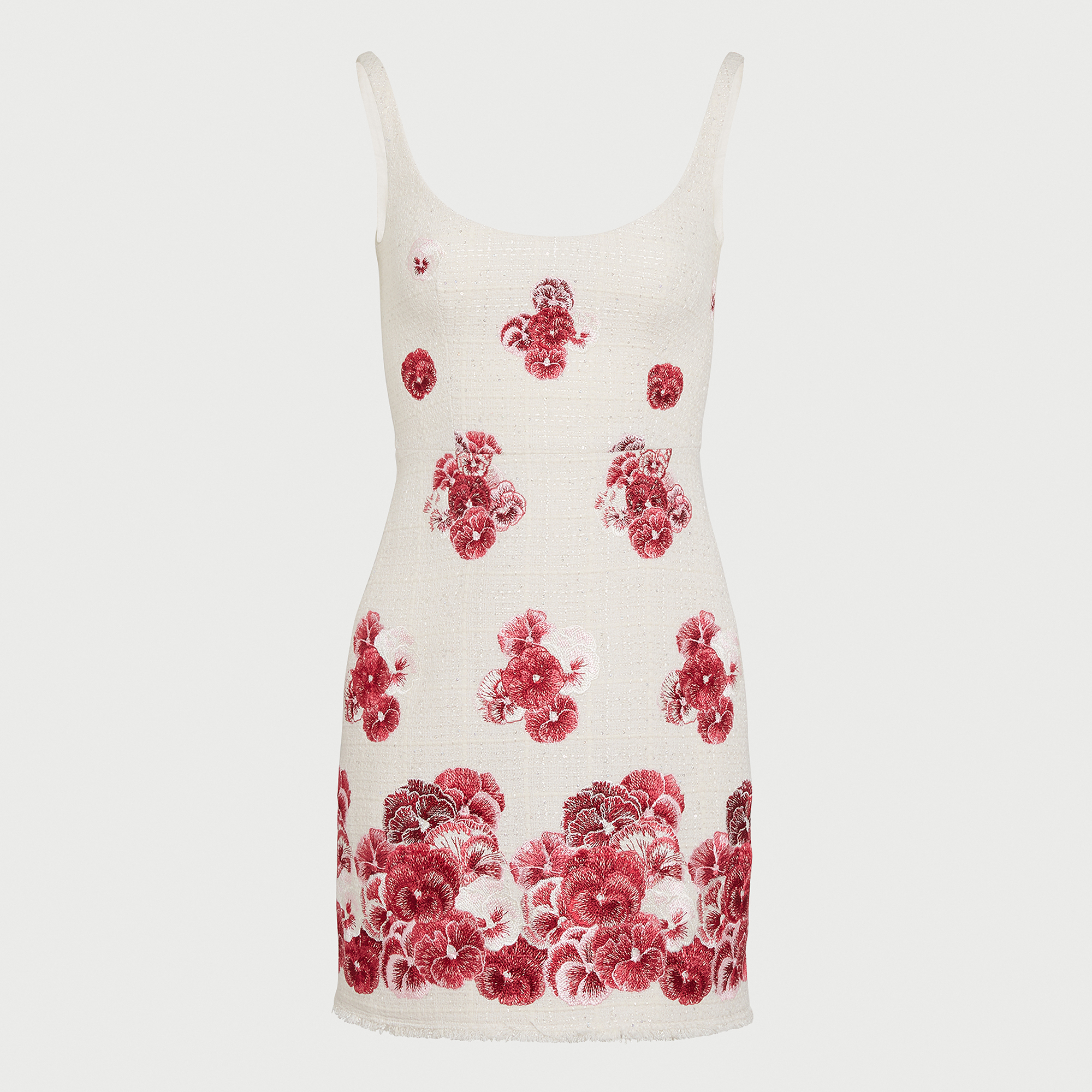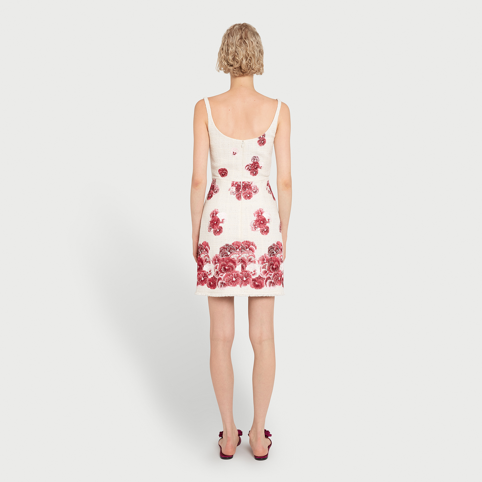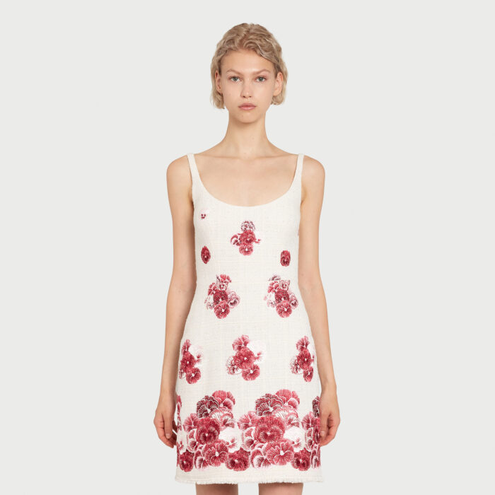 Cette robe courte en bouclé brodée Ruby Pansies présente une silhouette fluide avec un décolleté en goutte d’eau. Elle se ferme par une fermeture éclair invisible dans le dos avec un crochet.