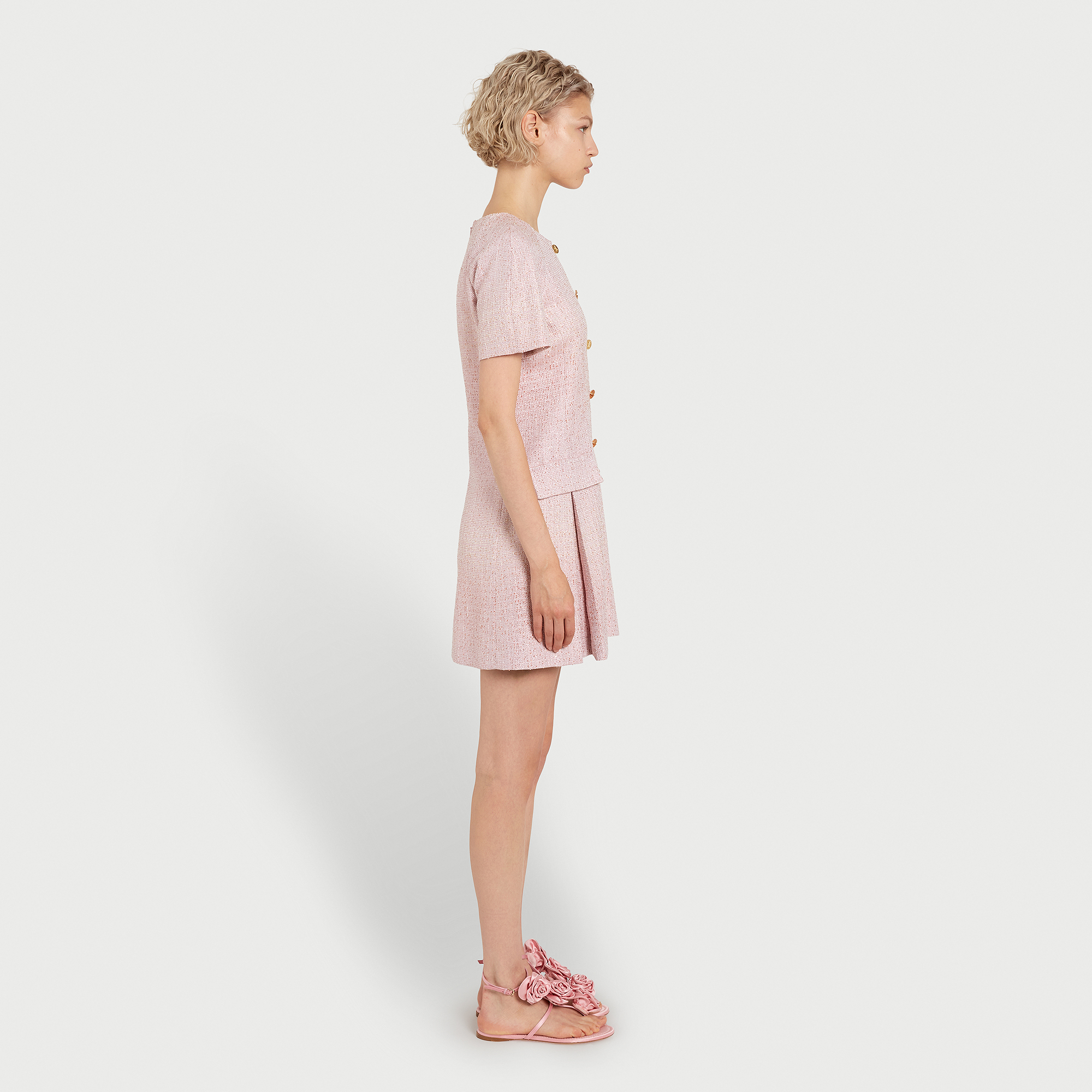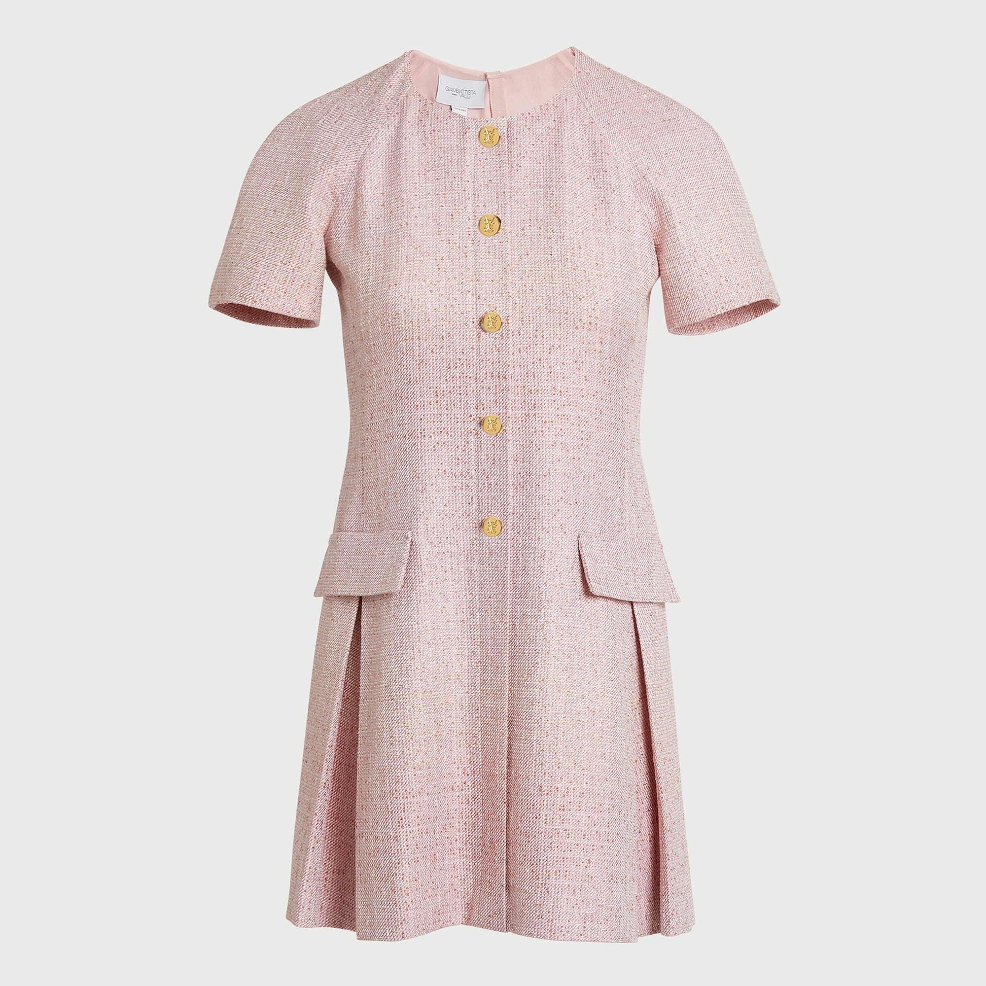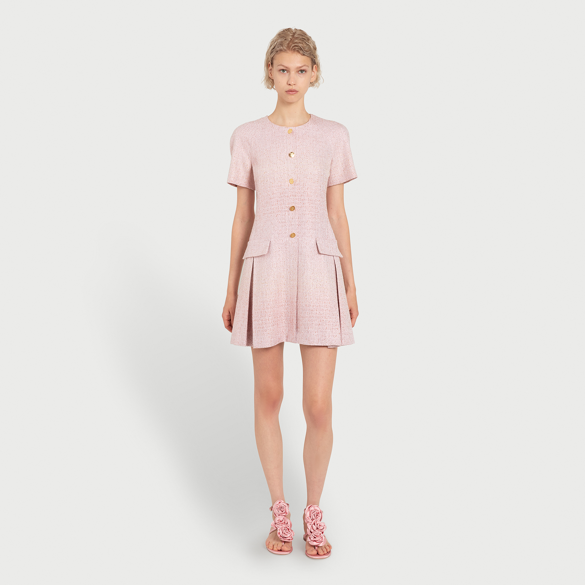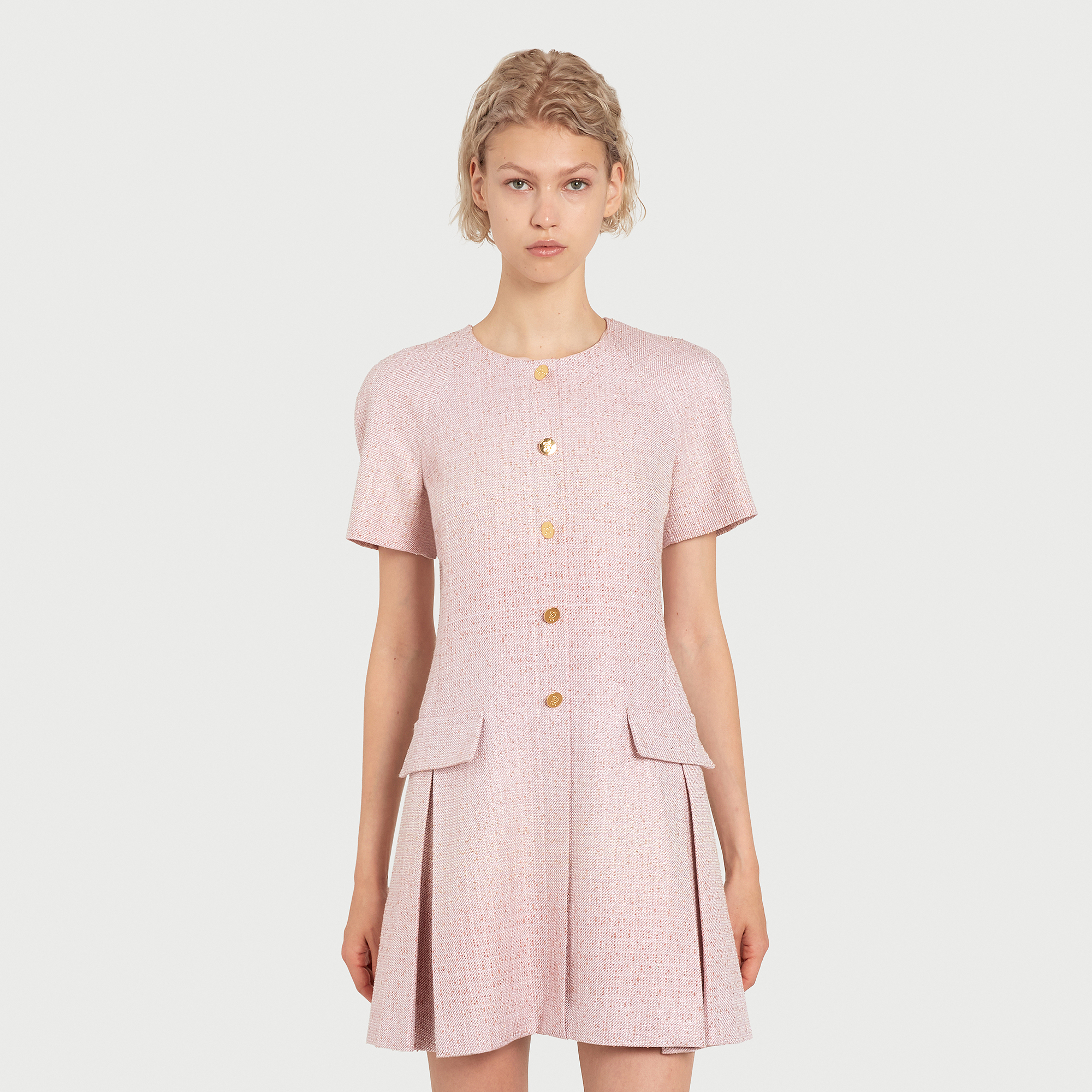 Cette robe chemise courte en tweed iridescent rose présente des manches courtes, deux fausses poches à l’avant, cinq boutons dorés siglés GBV sur le devant, ainsi qu’un zip invisible avec un crochet à l’arrière.