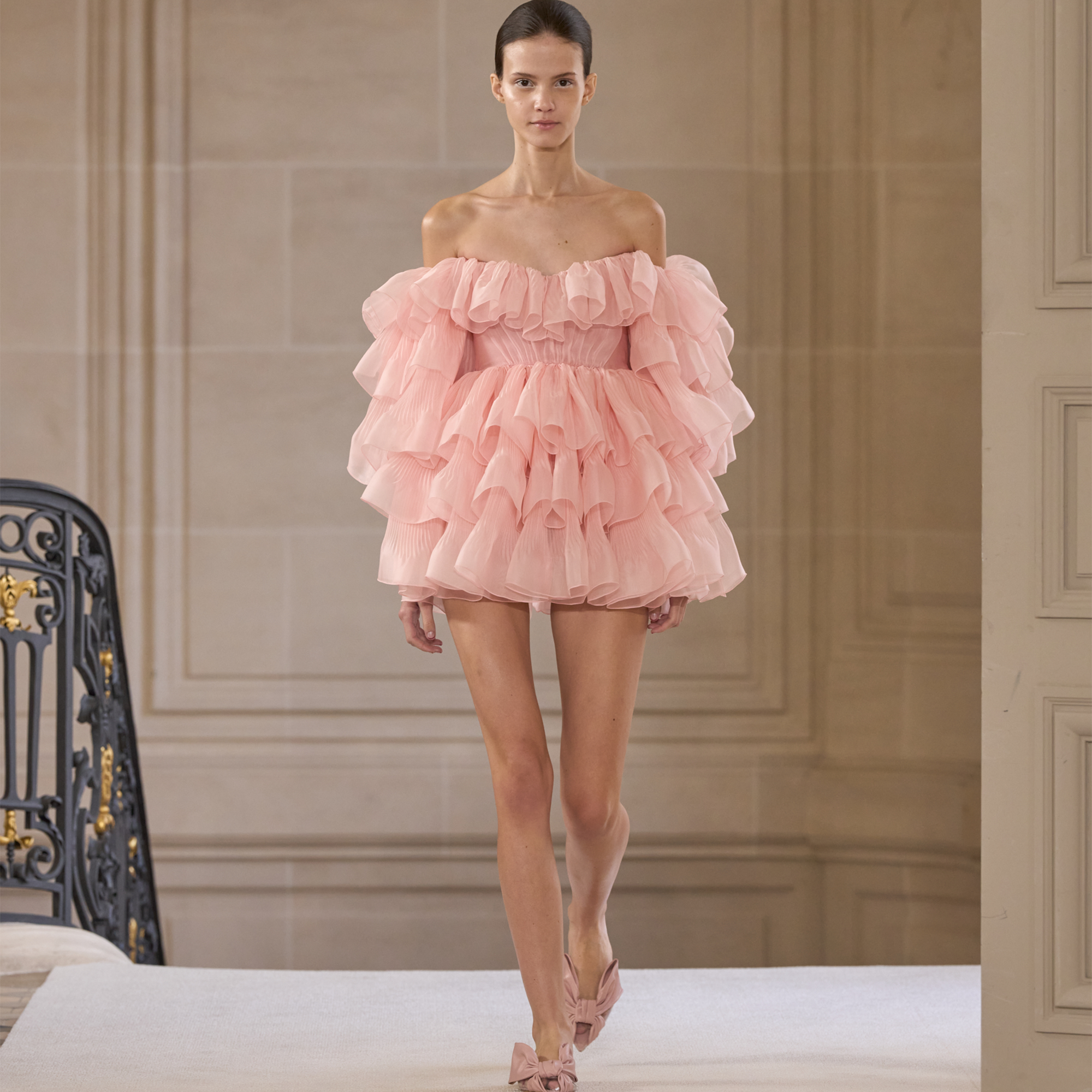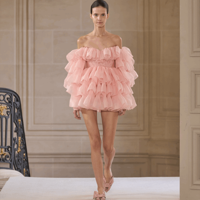 Cette robe courte rose bouffante à volants en soie dispose d’une encolure décolletée.