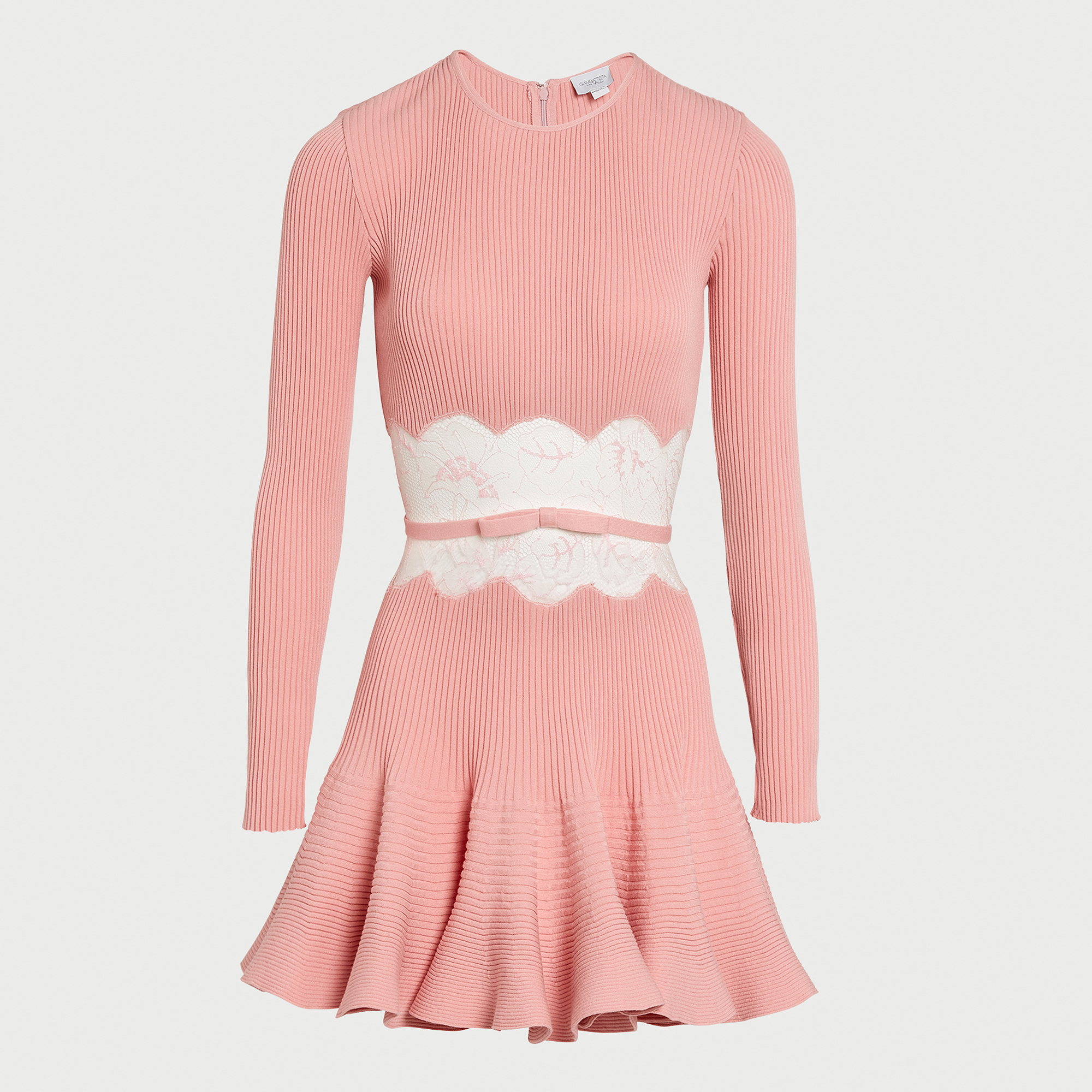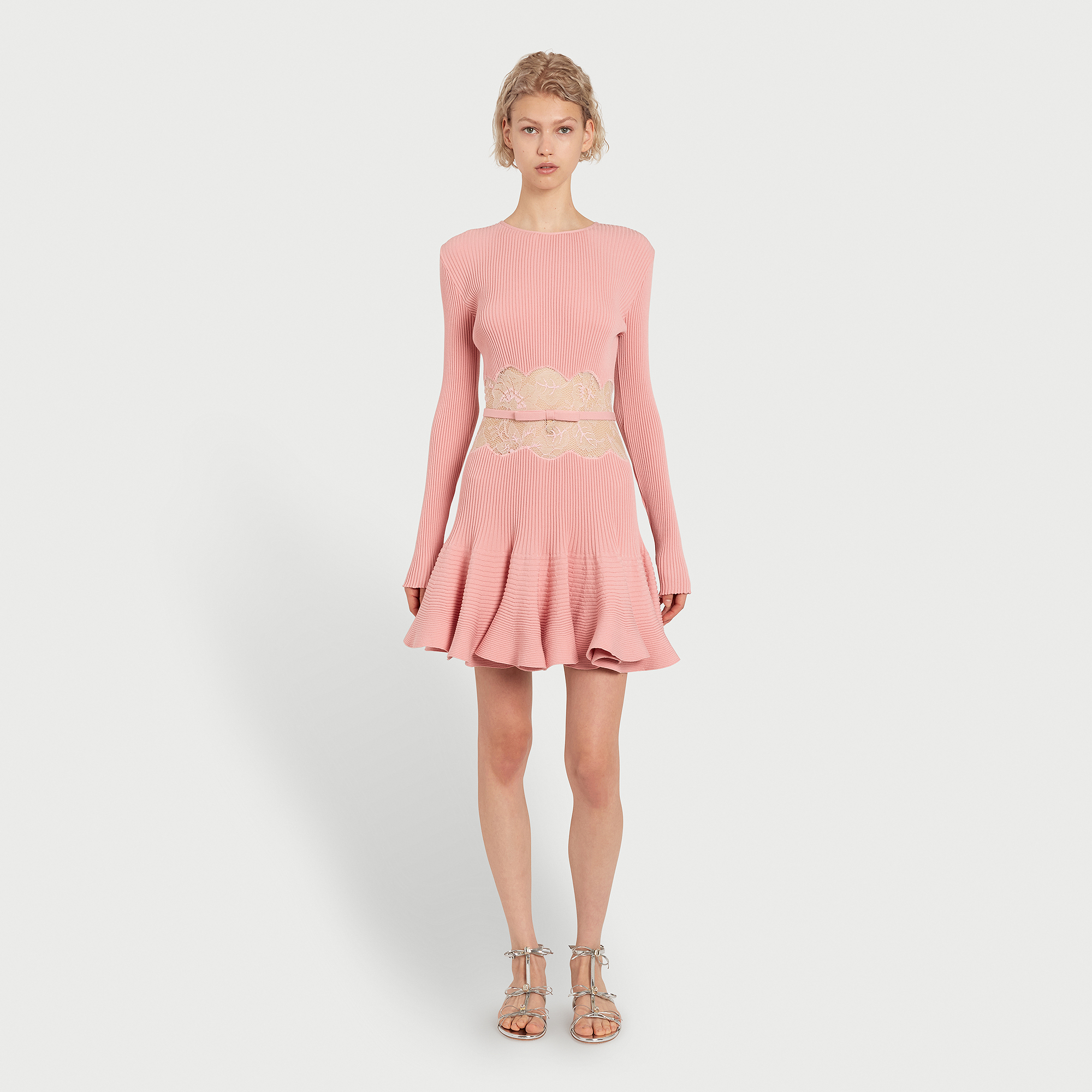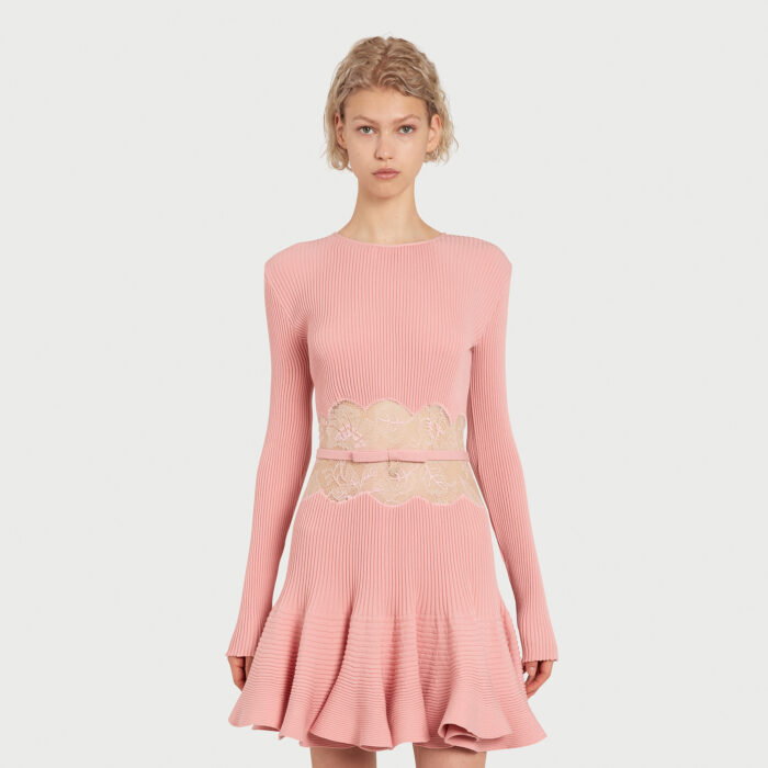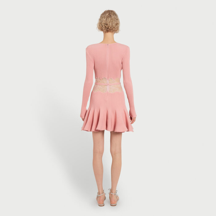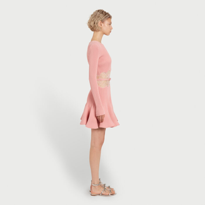 Cette robe courte rose en maille présente une silhouette ajustée avec une jupe trompette, reliée à un corsage à manches longues par un panneau en dentelle transparente. Une ceinture non amovible souligne la taille.