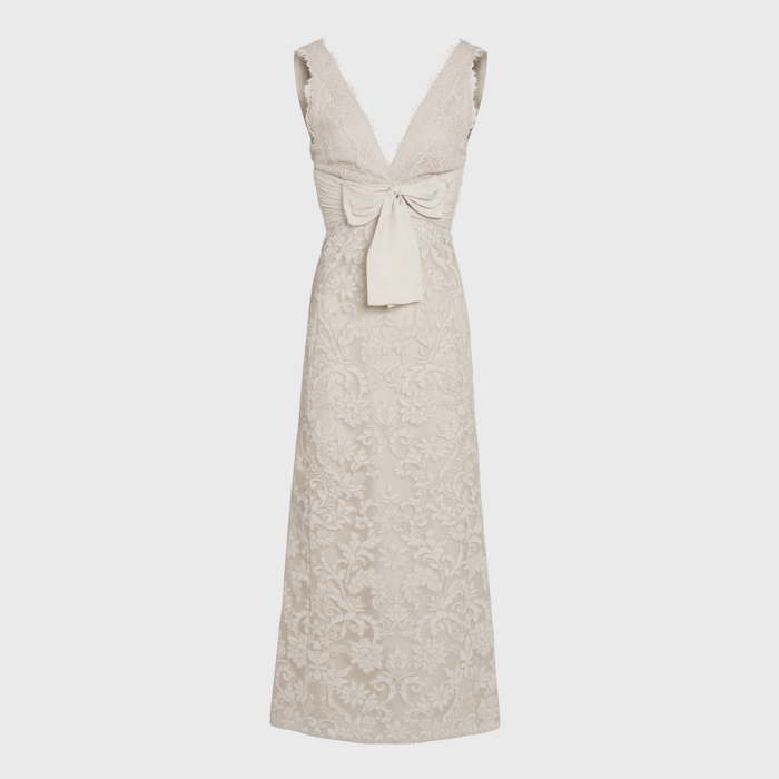 Questo abito midi color avorio in pizzo ricamato presenta una silouette stretta sulla vita e morbita nella gonna, con un scollatura a V. A finire l’abito un fiocco frontale centrale con una fascia avvolta in vita.