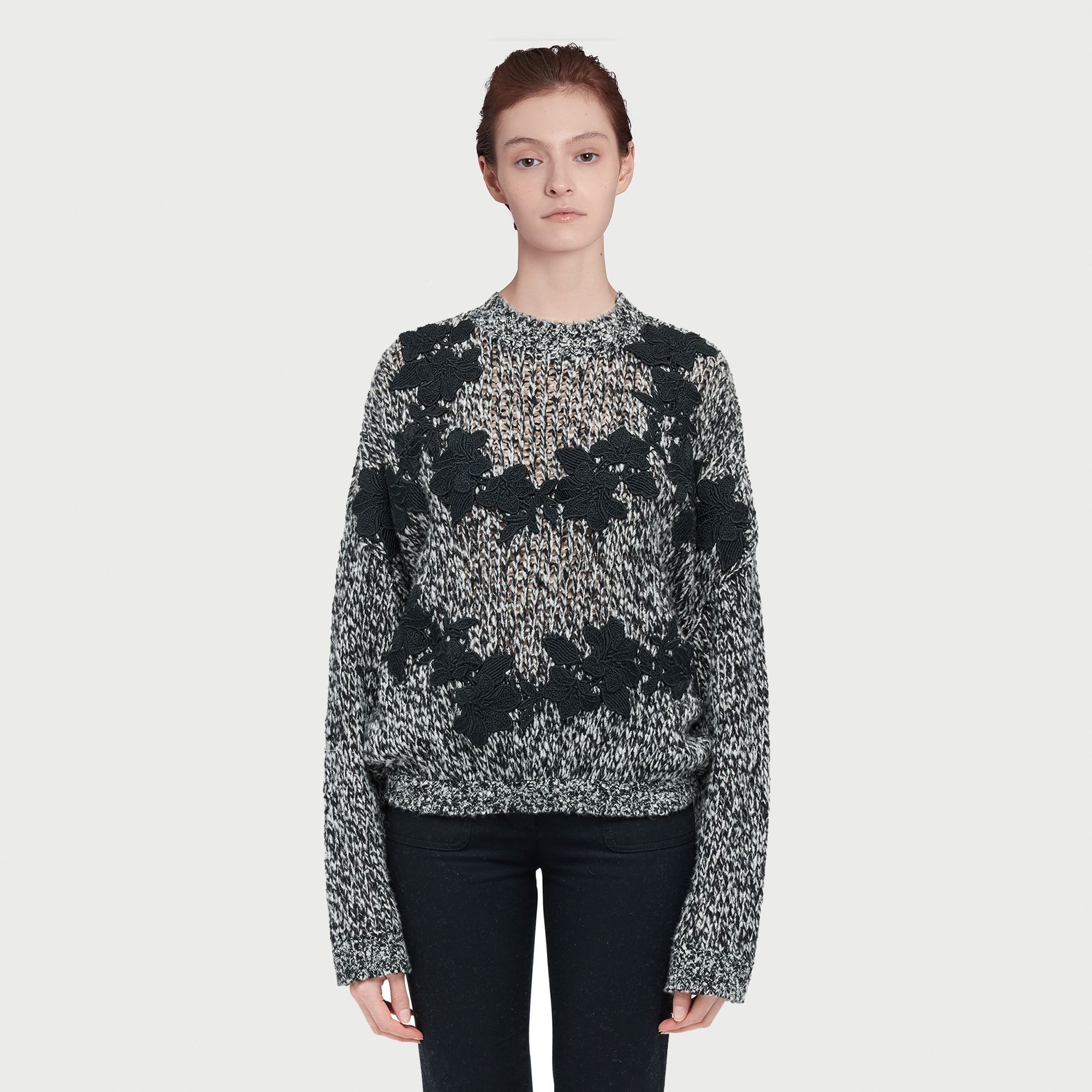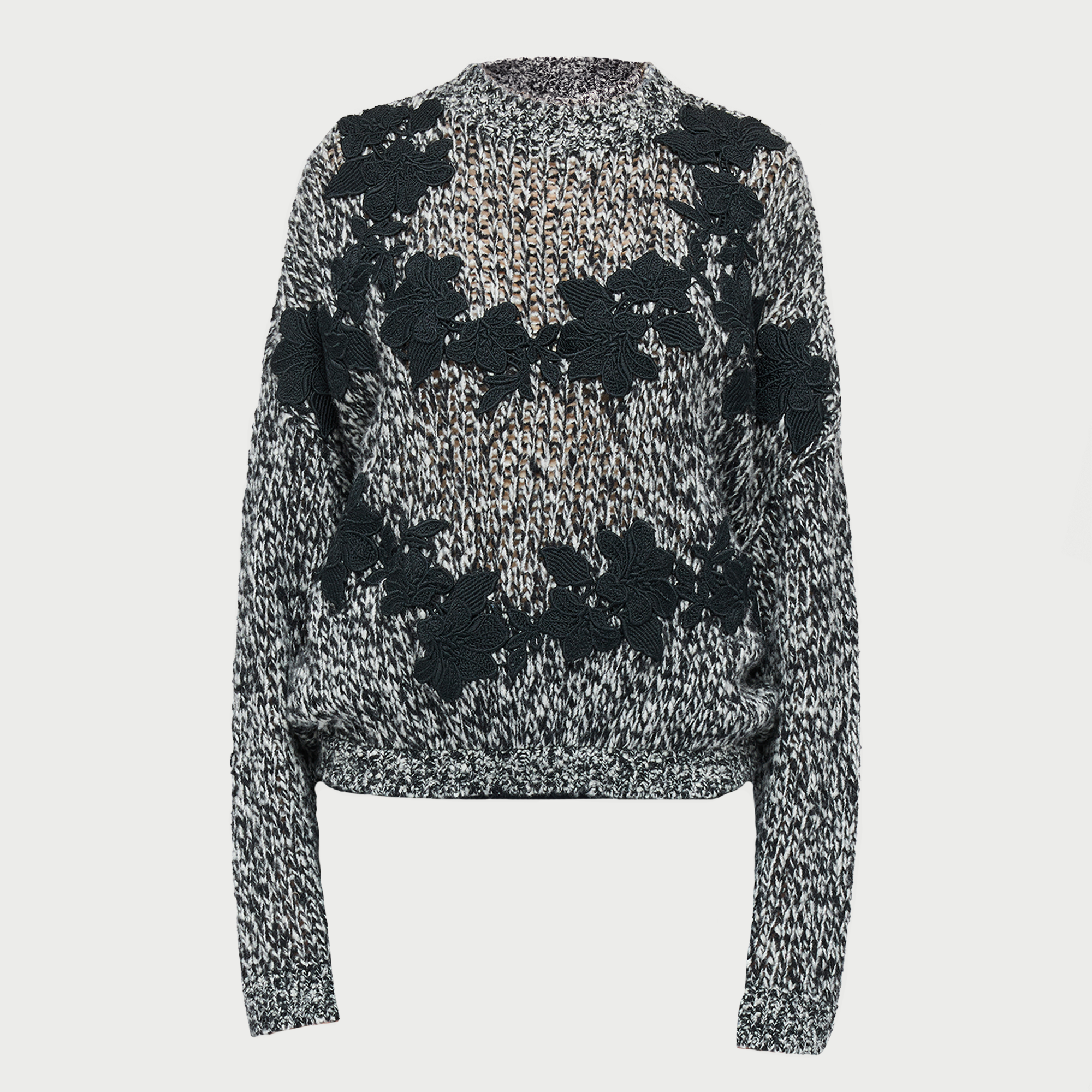 Questo pullover grigio in lana presenta dettagli floreali neri macramé.