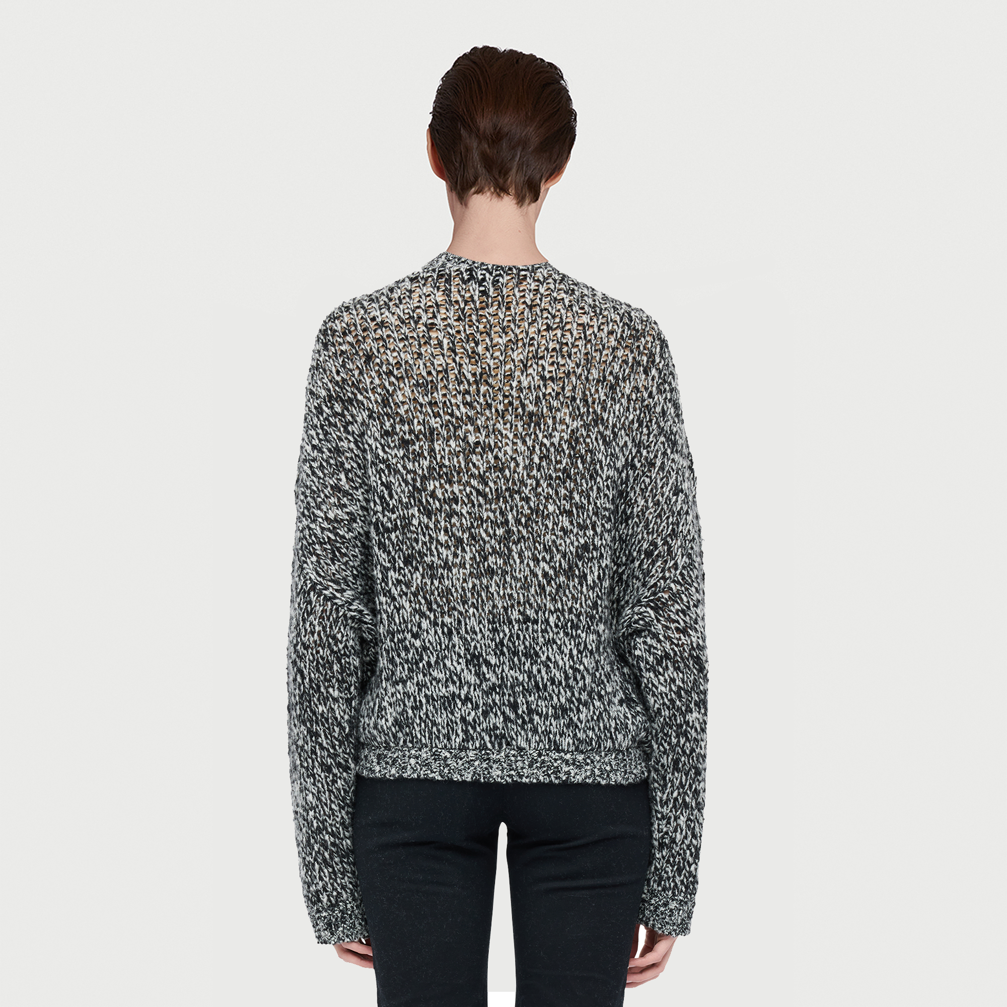 Pullover grigio in lana e macramé nero