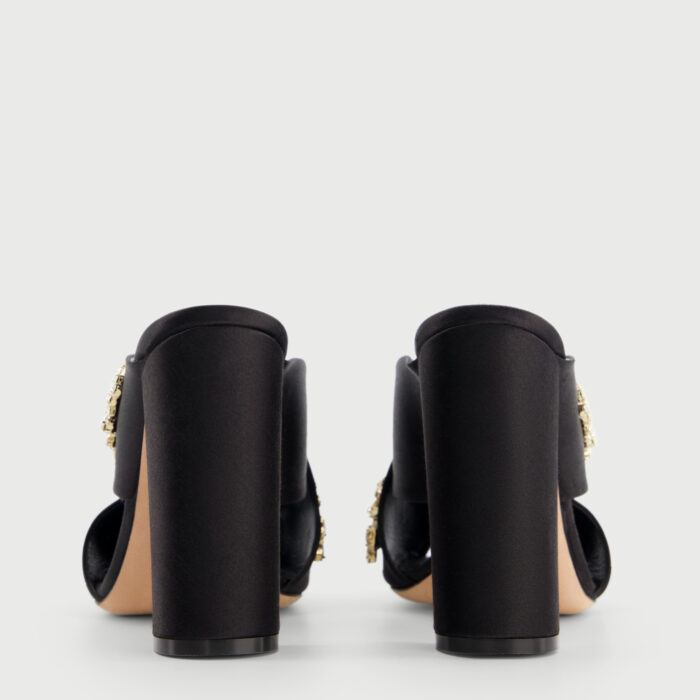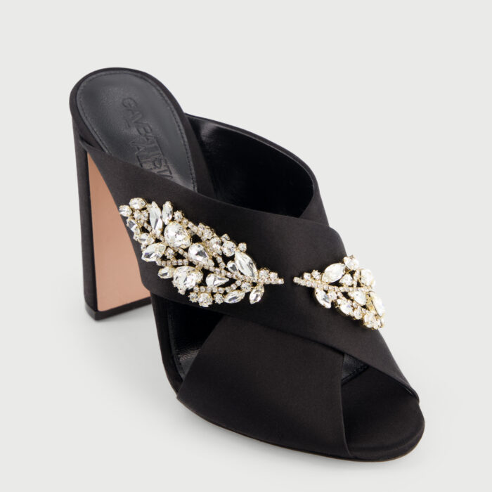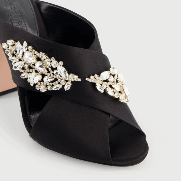 Questi sandali con tacco in raso nero presentano un cinturino incrociato sul davanti decorato con strass, una punta arrotondata e un tacco a mezzaluna.