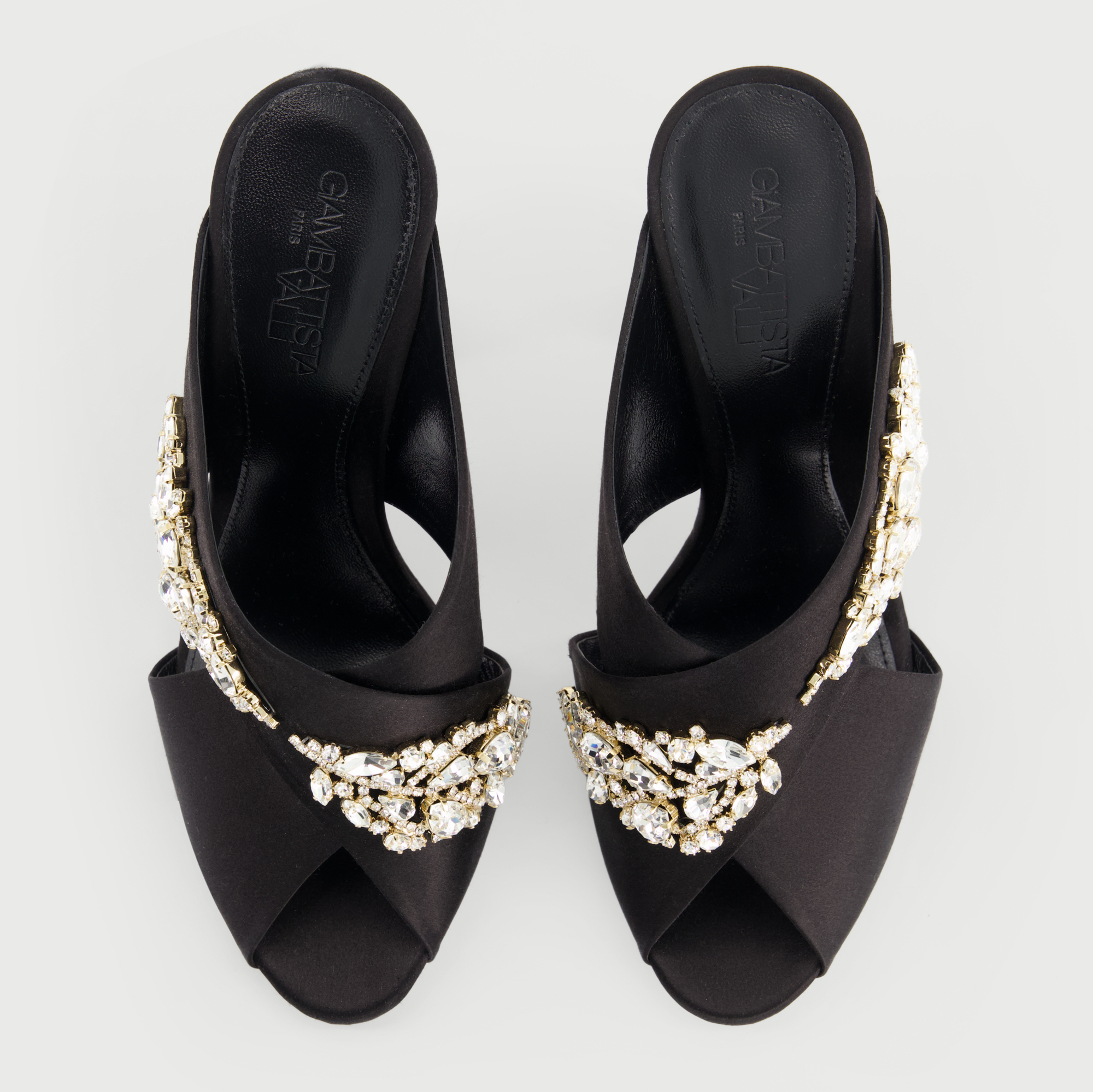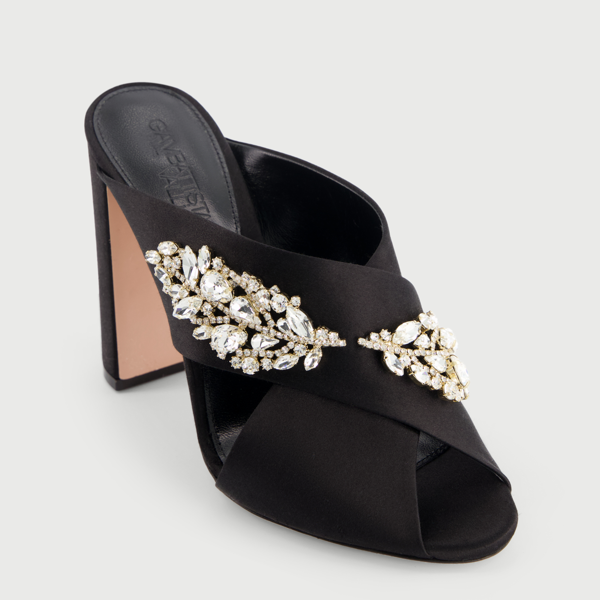 Questi sandali con tacco in raso nero presentano un cinturino incrociato sul davanti decorato con strass, una punta arrotondata e un tacco a mezzaluna.